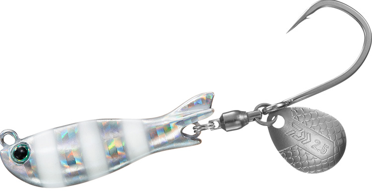 素材は、高比重タングステンボディ。マッチザベイトに加え、飛距離と動きの速い群れにいち早く到達させるためこの素材を採用。ブレードはコロラドタイプで大きな波動でアピールするとともに、カタクチなどメインベイトの泳ぎにアジャストさせることを意識したブレードタイプとして採用。