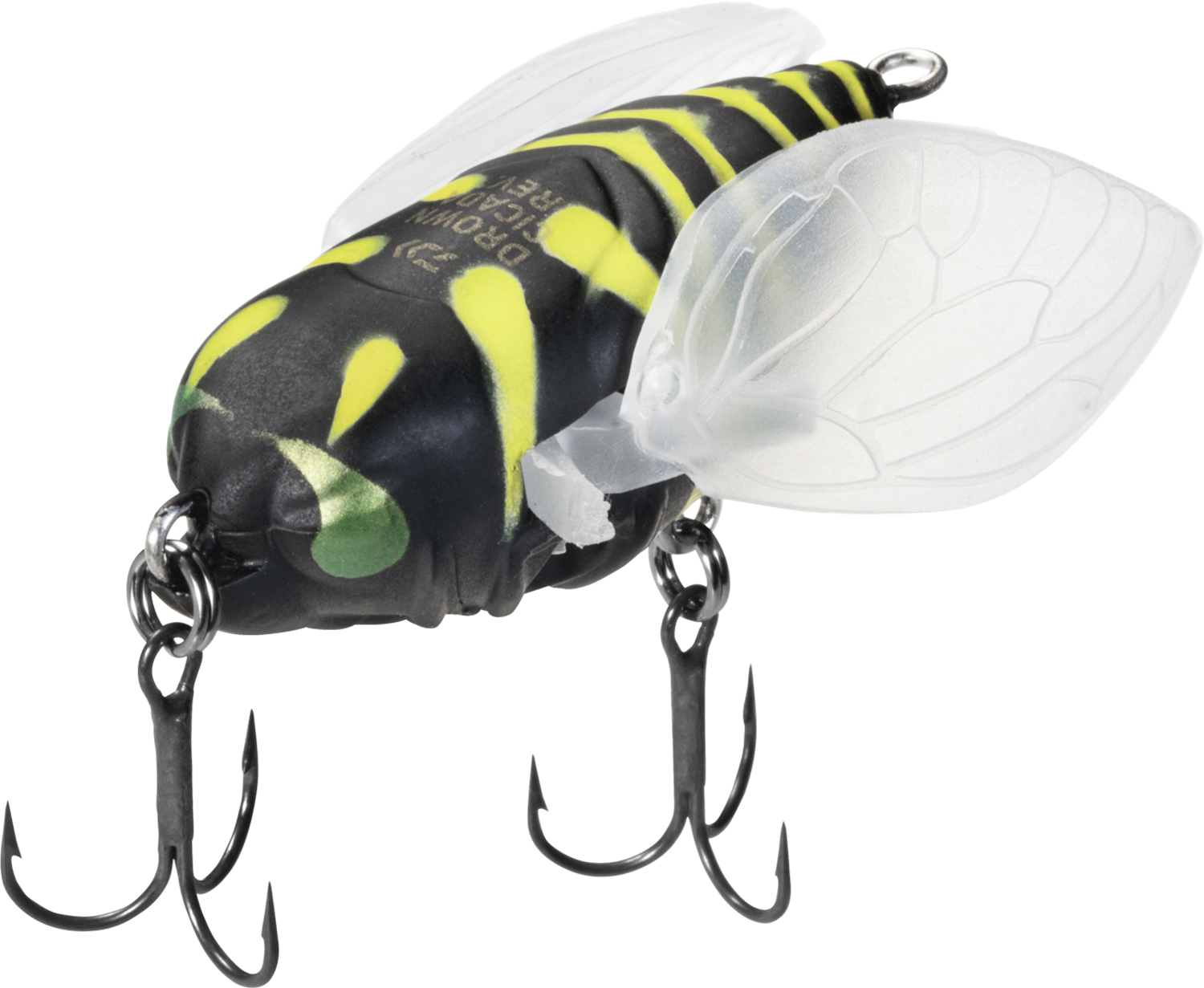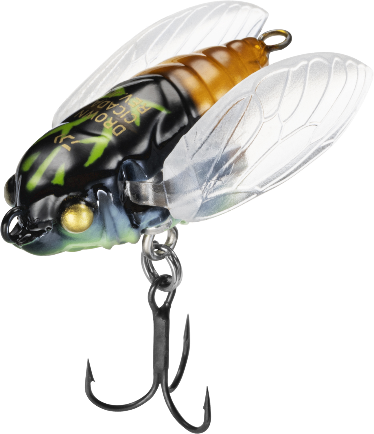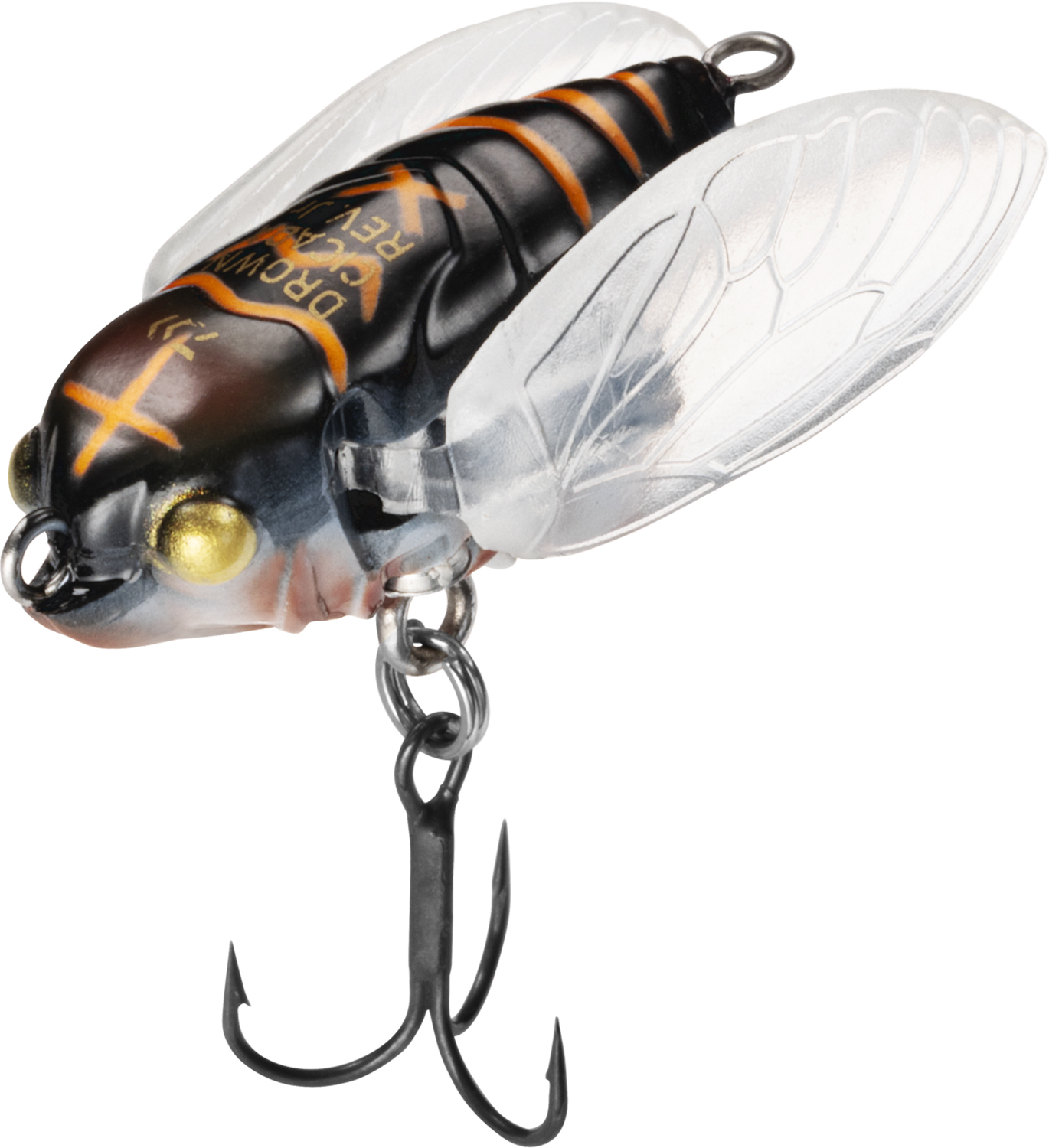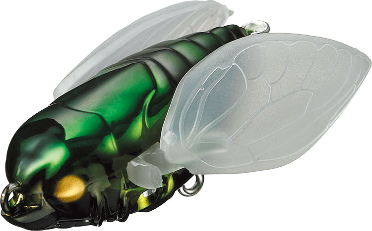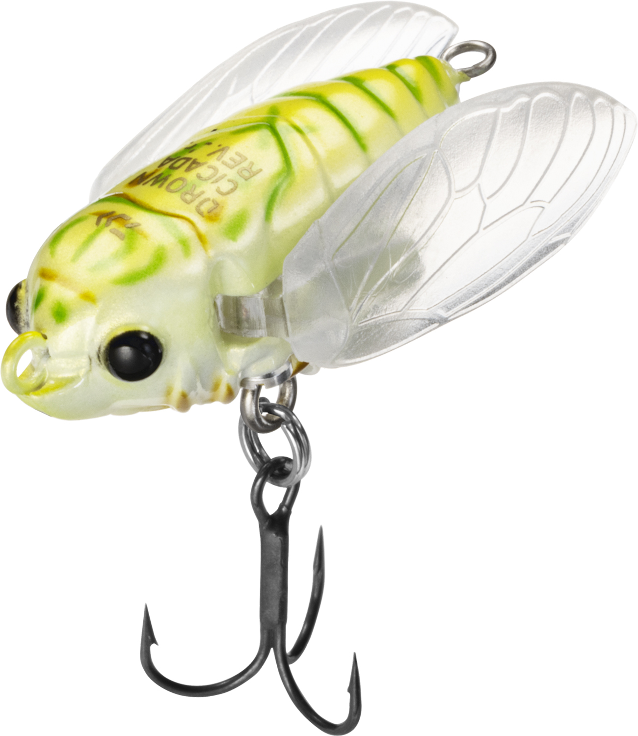 ドラウンシケーダREVのコンパクトサイズバージョン。小型の蝉や昆虫を捕食している時のマッチザベイト。蝉ルアーに求められる要素の中の飛距離に関してはボディ、羽根のデザインによりコンパクトながら十分な飛距を稼ぐとともに、水面に吹く風で流されにくいようにしている。