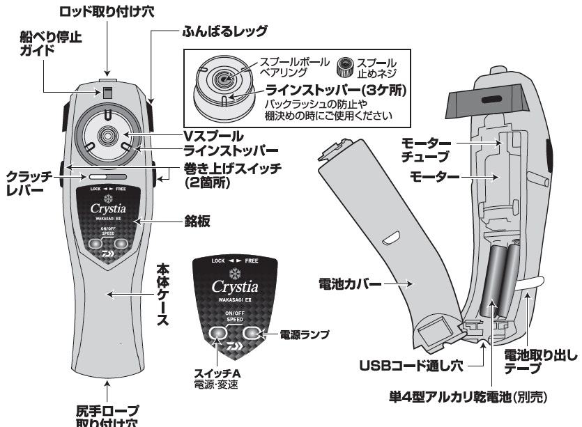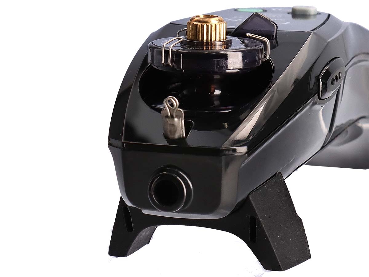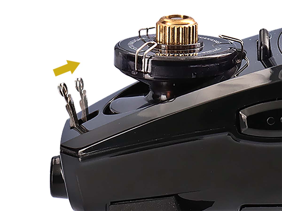 スプール上部の3箇所にラインストッパーを装備。アタリがよく出るタナ(魚の泳層)でラインをストッパーに引っかけることで、毎回仕掛けを落とすたびに自動的に同じタナで仕掛けを止められる便利な機能。