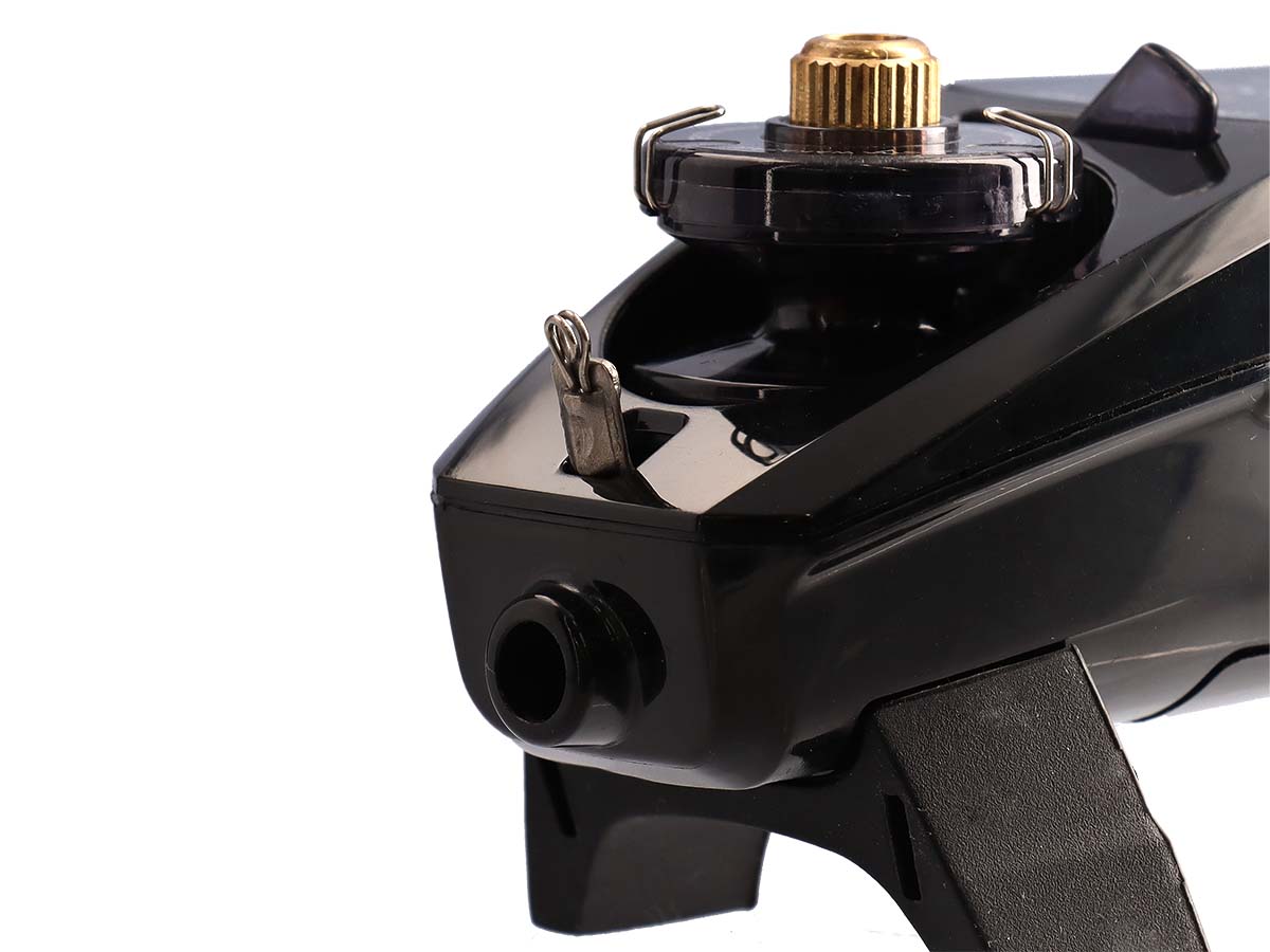 Φ5(直径5mm)の穂先が取り付け可能。取り付け穴に奥まで差し込み、しっかり固定されていることを確認(振動で緩むことがあるため、使用中も時々確認が必要)。