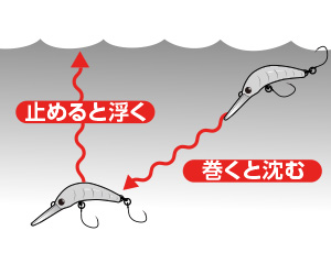 リールを巻くとリップが水を受け、テールを左右に振りながら沈む。巻くのを止めるとゆっくりと浮き上がる。