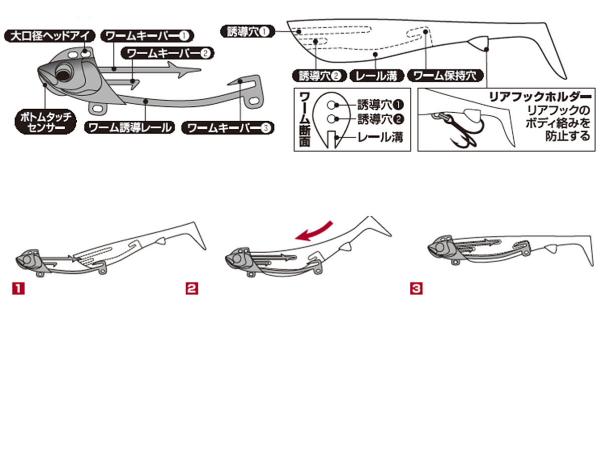 ジグヘッド側に3重ワームキーパーとワーム誘導レール、ワーム側にキーパー誘導穴(3箇所)とレール溝を設けることにより、ワームをジグヘッドの誘導レールに乗せて、そのまま誘導穴にキーパーを押し込み、最後に抜け防止ツメを尻のワーム保持穴にセットするだけで簡単装着が可能!