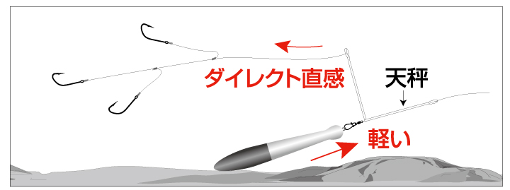 亜鉛の比重が軽いため、波の力や潮の流れで転がりやすく、オモリを転がしながら海底のヨブ(凹み)にはめて釣ることが可能(ヨブにはエサが溜まりやすく、キスの居場所でもある)。
