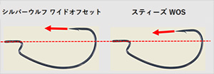 スティーズWOSと比較するとフックポイントがわずかに開いている。遠投時の掛け性能にこだわったフリーリグチニング専用設計となっている。驚異の貫通力SaqSasフック。