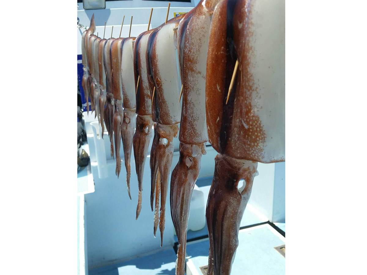 イカの魅力は何と言っても食味の良さ。釣れたイカは水や氷に直接当てないで持って帰ると透明さを維持できる。そのため、専用のトレーを使用し持ち帰るのがベター。ポイント移動中にスルメイカの沖干しや沖漬を作れば帰港後の楽しみも増える。