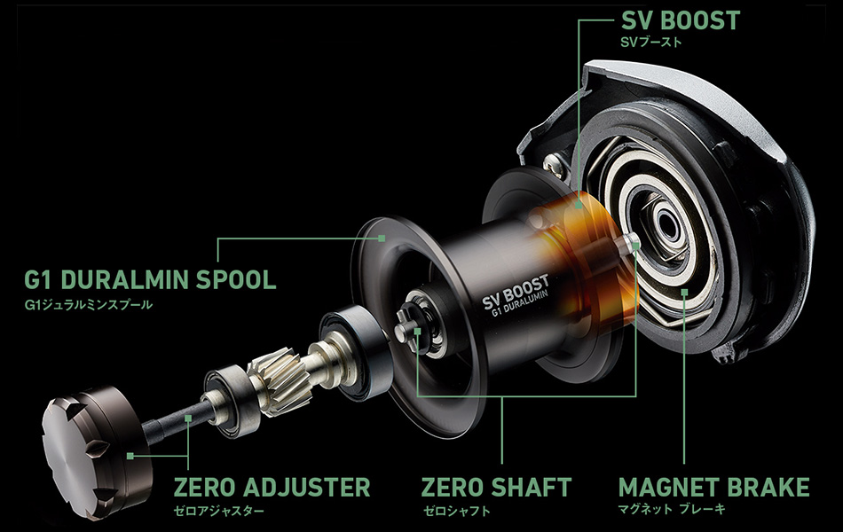 2021年、インダクトローターを主軸とするDAIWAベイトリールのブレーキシステムはいよいよ第三世代へと突入。SV(フィネス方向)にアドバンテージを持つブレーキシステムに更なる遠投性能を追加。従来、1段階だったインダクトローターが2段階に可変することで、フィネスキャスト領域で、最適に機能する画期的な機構。それが『SV BOOST』という傑物だ。