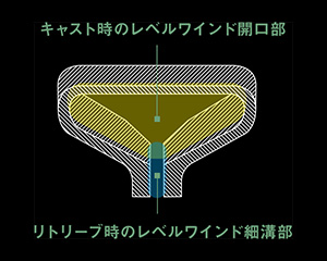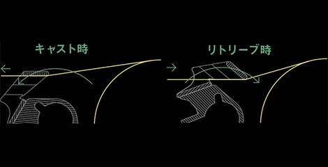 クラッチと連動してレベルワインドが半回転するターンアラウンド式TWS。クラッチOFFでレベルワインドは後傾して、細溝へとスイッチ。リーリングと共に左右へ連動して、ラインをスプールへと精密にシンクロ収納。