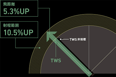 両軸ベイトリールのキャスティングにつきまとう永遠の課題、バックラッシュを最大限に防ぐDAIWA独自のテクノロジーがTWS(=T-Wing System)。唯一無二のコンストラクションと共に、ラインの抵抗を劇的に減少するフリクションフリー性能を徹底追求。画期的なレベルワインド機構として、既に世に知られていることだろう。 通常バックラッシュとは、キャスト時に急激に回転数を増すスプールから放出されるラインの過剰供給が要因。勢いづいたスプールが高回転を持続する一方で、従来の狭小なレベルワインドは放出を妨げるかのように収束して強い抵抗を与えたために、行き場を失ったラインが複雑に絡み合ってしまうもの。いわば、ラインの渋滞が招くアクシデントとも言える現象だった。 現代のTWSはかつてのフリップオープン式から、ターンアラウンド方式へと進化。クラッチのON/OFFに同期してレベルワインドが前後に半回転。キャストにも巻き取りにも順応する省スペースな機構は、筐体のコンパクト化の一助ともなっている。 キャスト時のONではT型大開口部が前傾して、スプールから放出されるラインをスムーズに送り出しトラブルを大幅に低減。遠投性能が大幅に向上するのみならず、そのラインフリー性能は、ルアー着水後においてフォール時のスピードアップにも貢献する。 一方の巻き取り時には、後傾して姿を現わす細溝が機能。ハンドル回転に連動して左右への往復を繰り返し、ラインをスプールへと精密にシンクロ回収。キャスト時のライン放出に際して、整然とした糸巻面がスムーズに解き放たれることで飛距離面でのサポートとなることは言うまでもないだろう。 圧巻のライン放出力によって異次元の飛びを可能にするTWS。例えるならそれは、まさに“アクセル”とでも呼ぶべき存在だろう。臆せず最大限に踏み込むこと、それがハイパードライブを実現する鍵だ。 ![]()