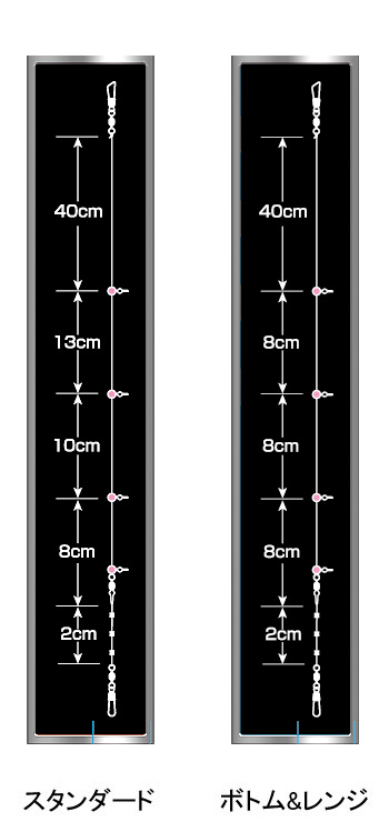 あらゆる状況に対応できる"スタンダードモデル"と、エダス間隔を集中化させてエサを集中させて底や宙を集中攻撃可能な"ボトム&レンジ"の2種類を用意。