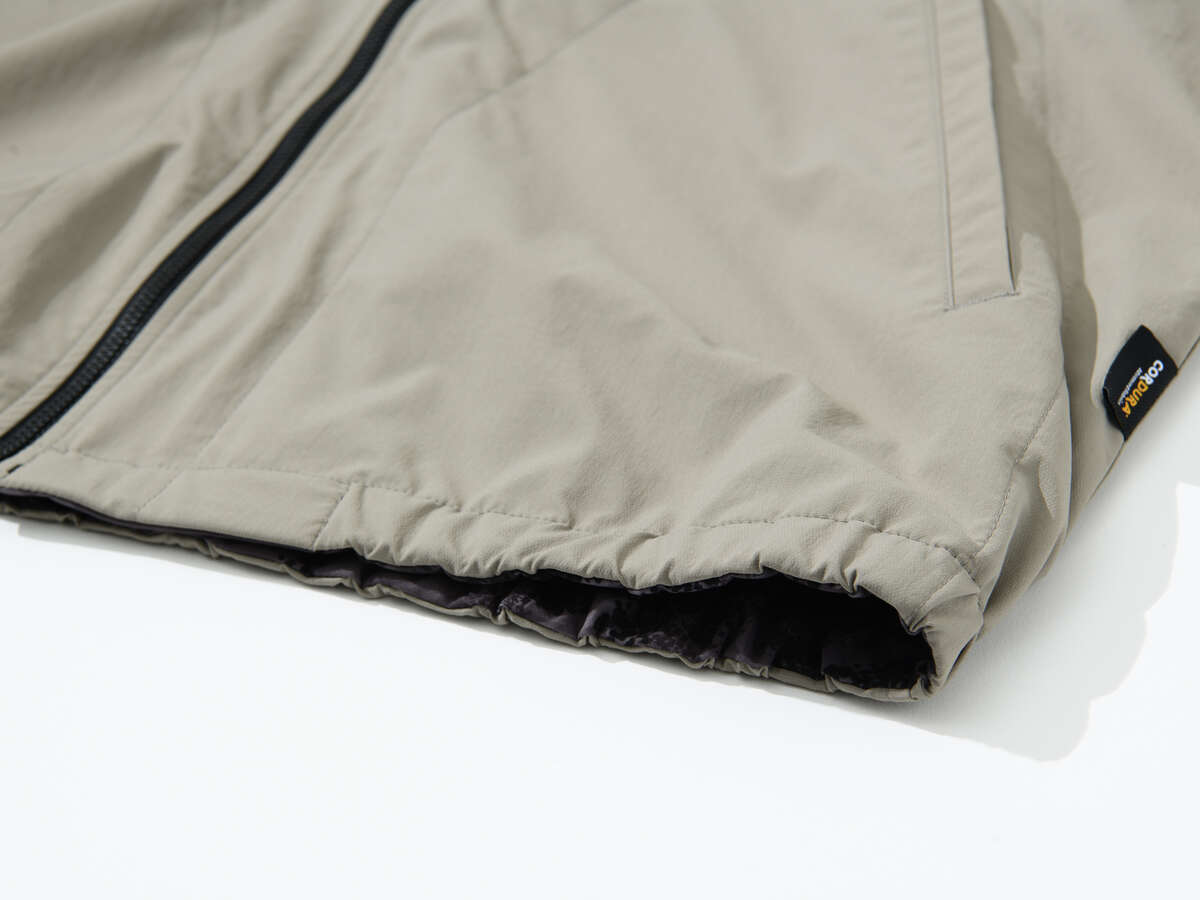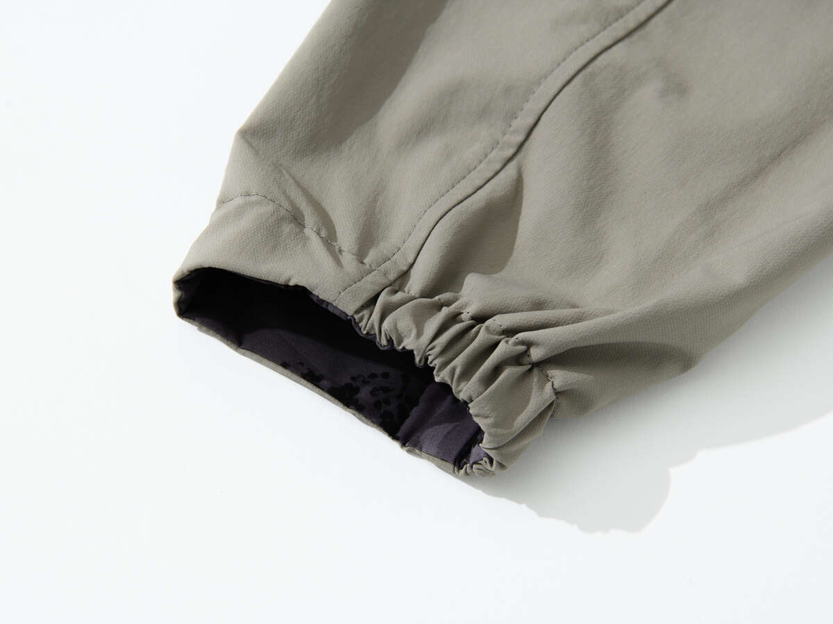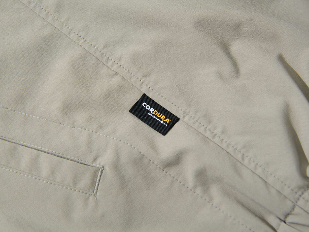 表面(無地面)には、撥水かつ摩耗に強いCORDURA®素材を採用し、軽い岩場歩きや藪漕ぎの際にも便利。裏面(柄面)にもポリエステル100%且つストレッチのある撥水素材を使用。襟付きのコーチジャケットとして普段使いはもちろん、裏表ともにストレッチ性があるため、動きの多い釣りでもシームレスに活躍する。