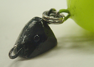 シンカーはフラットな底形状。水中で種を動かすためにシンカーは転がりにくくしている。