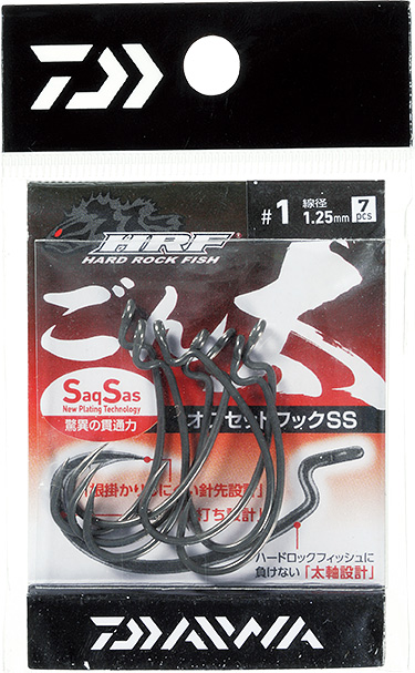 パワーが求められるロックフィッシュゲームのための、太くて強い「ごん太」オフセットフック。線径#1~2/0は約1.25mm。3/0サイズは1.35mm。不意に大型がフッキングしても余裕のパワー。ハリ先にややネムリを入れることで、ハリ先だけワームに食い込ませることが可能で、絶妙なスナッグレス効果とバレにくさを兼備。根掛かりを恐れず積極的なアプローチが可能となる。大型ワームもしっかり保持するデカクランク設計で、驚異の貫通力を誇るSaqSas仕様。さらに貫通力をよりアップさせるロングテーパー尖頭設計。