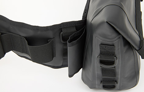 防水ターポリン生地を使用し、開口部は水の入りにくいロールトップ仕様。本体正面とサイド部にはベルトループとDリングが装備されており、そこに小物を取り付けることが可能。内部にはスリットポケットも備わっており、ロッドやネットなどを取り付けることができる簡易ロッドホルダー付き。プライヤーホルダーや暗い場所でも見つけやすいリフレクターも装備されています。