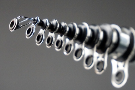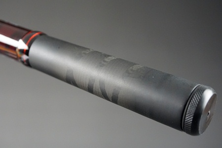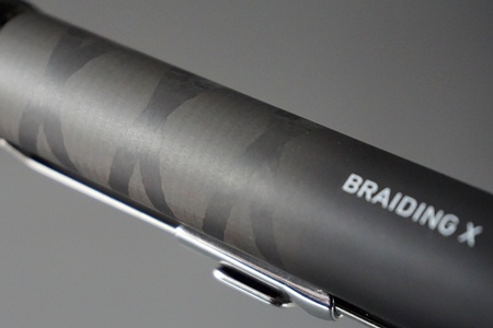 ブランクのバットセクション最外層をカーボンテープでX状に締め上げることで、ロッド操作時のパワーロスにつながるネジレを抑制するための強化構造。