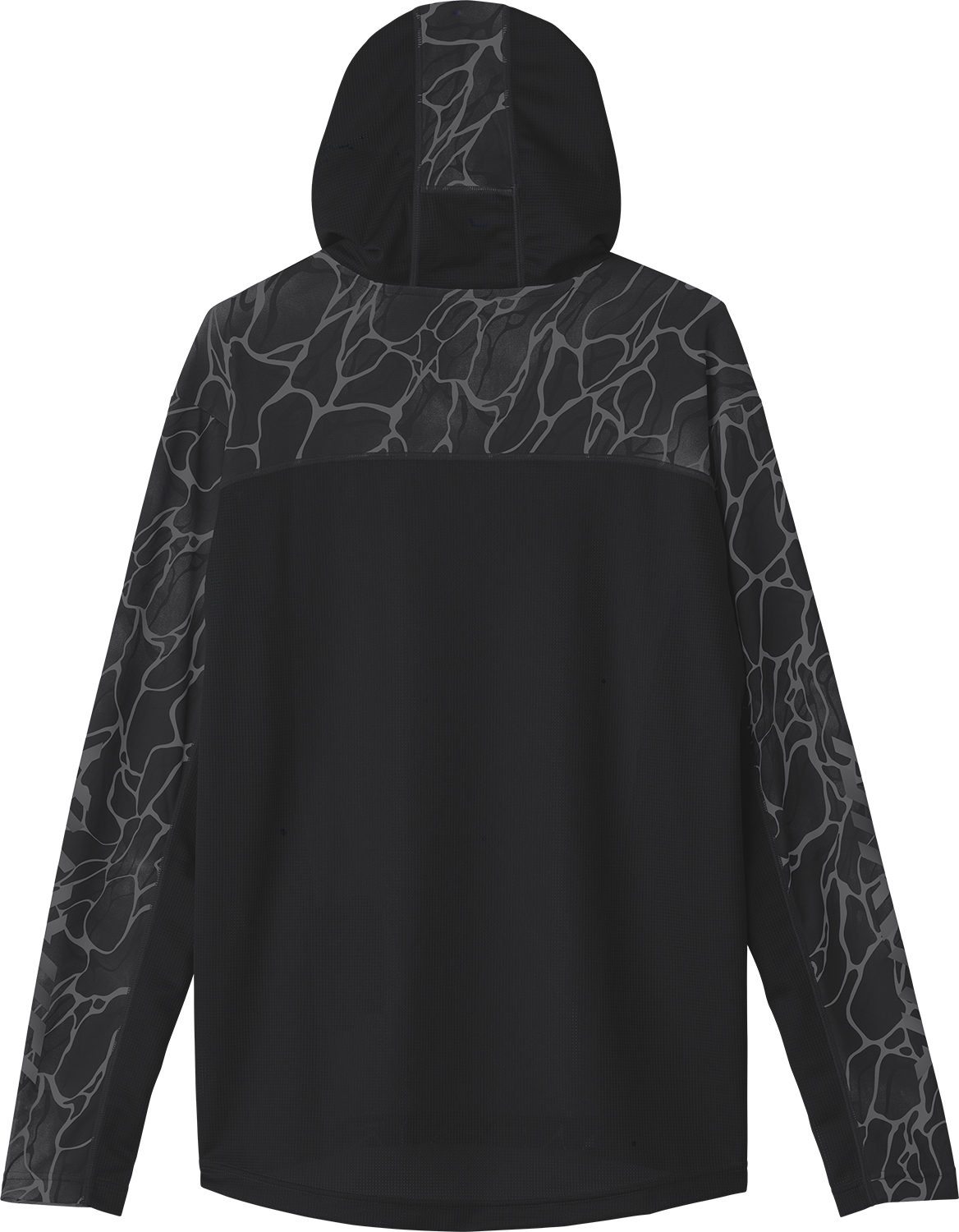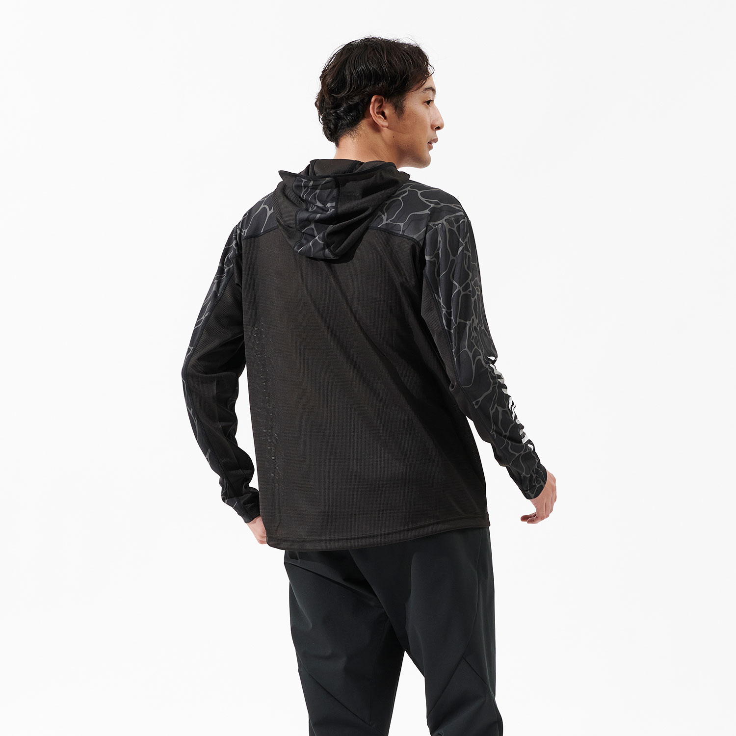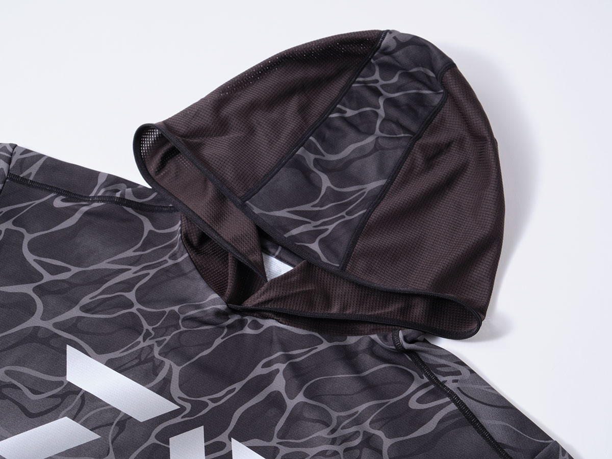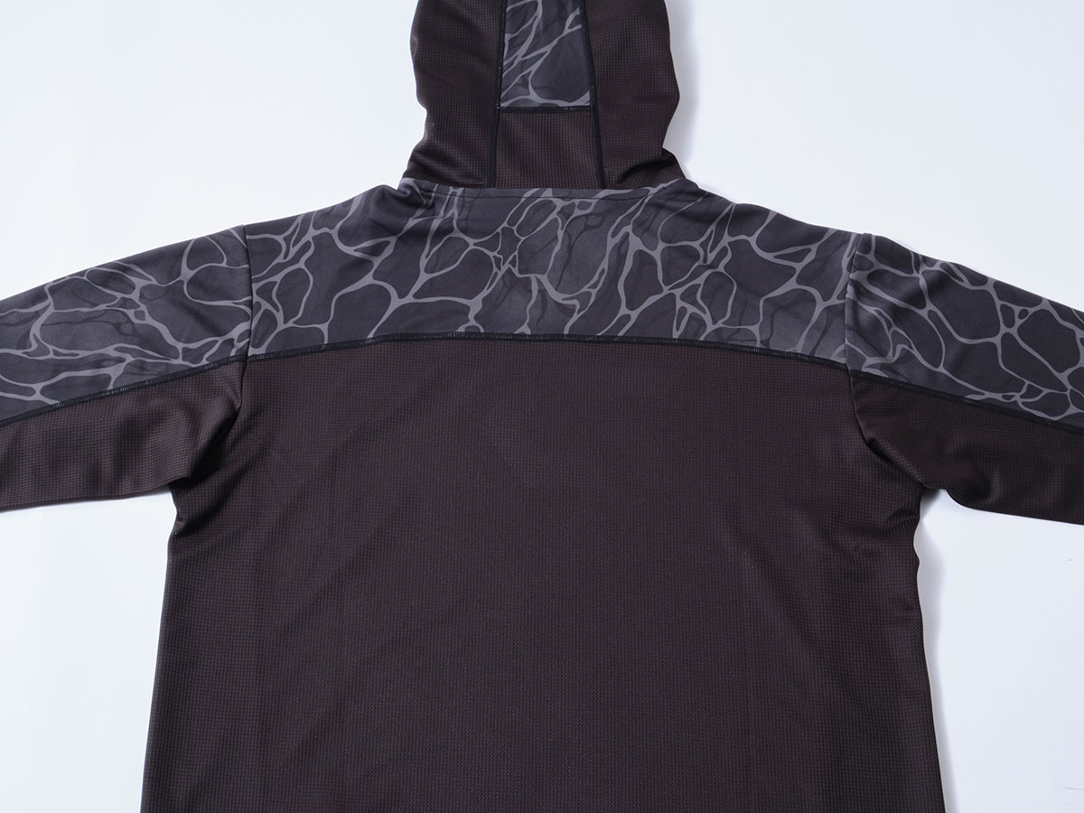 フード首部、後身頃、脇下は、風通しの良いメッシュで切り替えている。