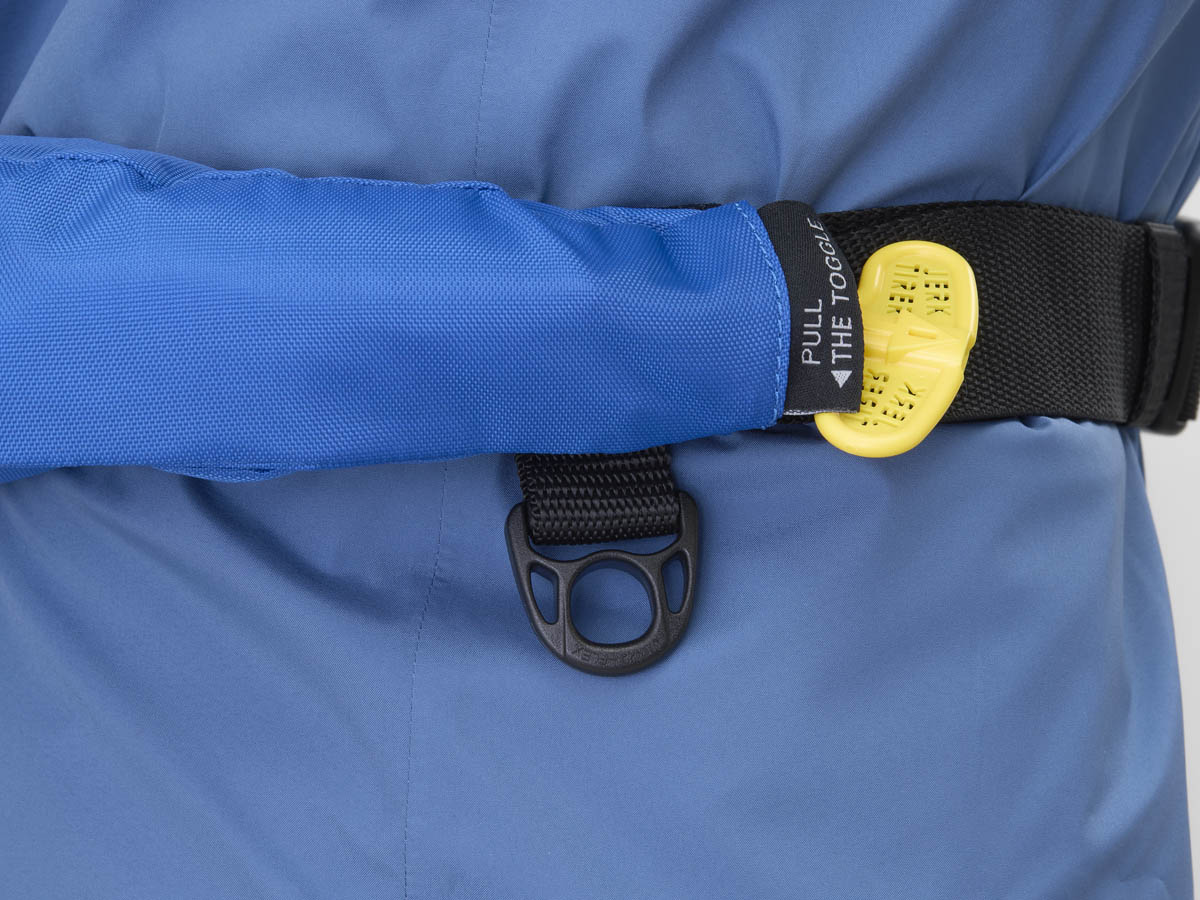 ライフジャケットの梱包パッケージを見直し、保管や移動時の持ち運びに便利な収納袋として再利用可能なものに変更。小型船舶用救命胴衣TYPE-Aを取得し、腰回りにしっかりフィットするオリジナル立体裁断設計を採用。両サイドにDリングを装備し、多彩なアクセサリーパーツの取り付けが可能。膨張時にはO字型の気室が飛び出し、安定した浮遊姿勢が取れる。装着時の厚みは約5cmで、船縁をスムーズに歩行可能。