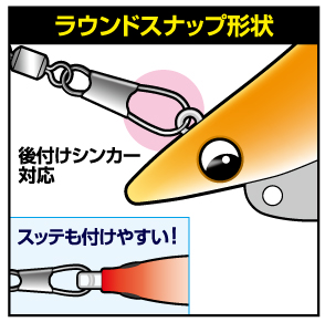 突起がないラウンドスナップ。リーダー絡みがなくエギやスッテをつけやすいストレート形状。
