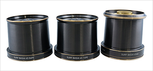 「サーフベーシア45」は、競技会でのシビアな釣りに対応する一方で、ミドルモデルとハイエンドモデルの橋渡し的な役割を担うアイテムでもあります。トーナメントサーフのスペックを継承しつつ、トラブルレス性能を高めるため、「サーフベーシア45」には、これまでSLP WORKSのオプションのみの設定だったテーパー角2°のスプールを標準装備としました。