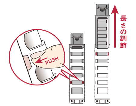 着脱可能なので不使用時は余計なスペースをとらない。長さは5段階(全長:約300mm~420mm)で調整可能。直径33mmまでの竿、玉の柄に対応。