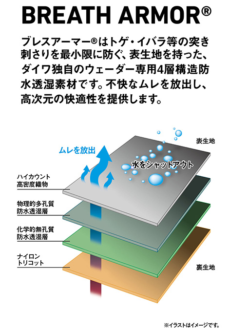 不快なムレを低減するダイワ独自のウェーダー専用4層構造防水透湿素材『ブレスアーマー』採用。