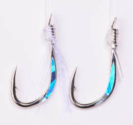 針の胴打ち部分に光沢のあるホログラムシールを直貼りし、ベイト(エサ)掛かりが飛躍的にアップする仕様になっている。また針の光沢を損なわずに少量のケイムラフラッシャーをプラスすることでベイト(エサ)掛かりが向上。