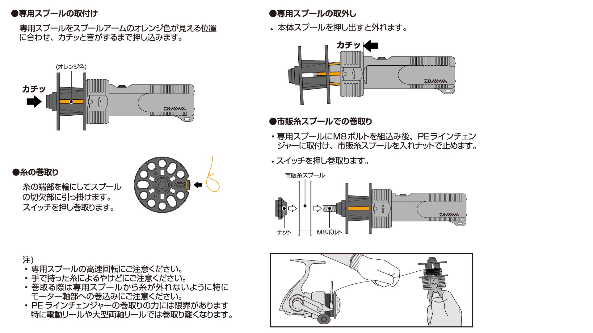 市販糸スプールに糸が巻ける!PEラインチェンジャー専用のワンタッチ着脱専用スプール。