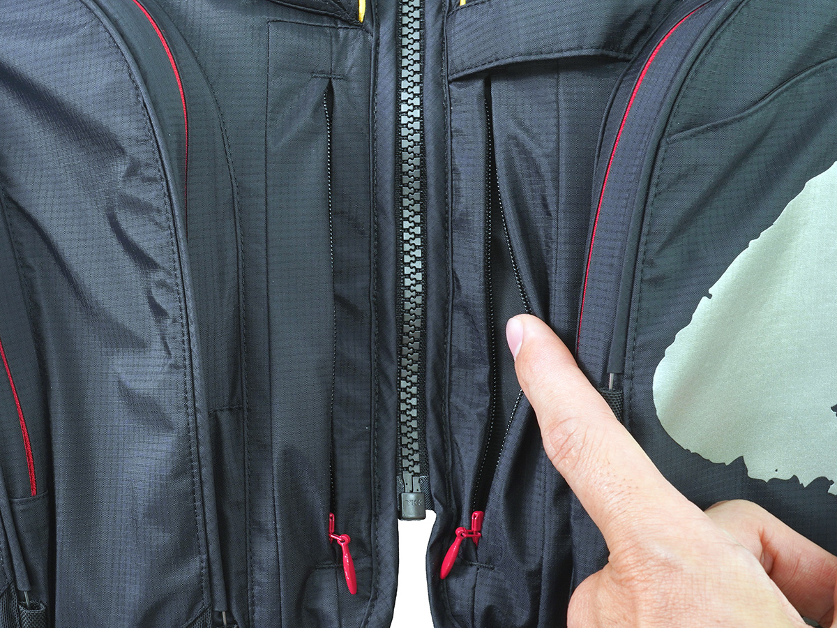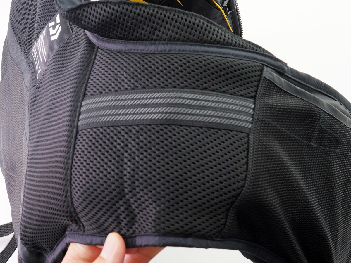 ボタンおよびファスナーの取り外しにより背中の通気性を調整可能。通気性を最大限確保するために、パネル全体を取り外すこともできる。