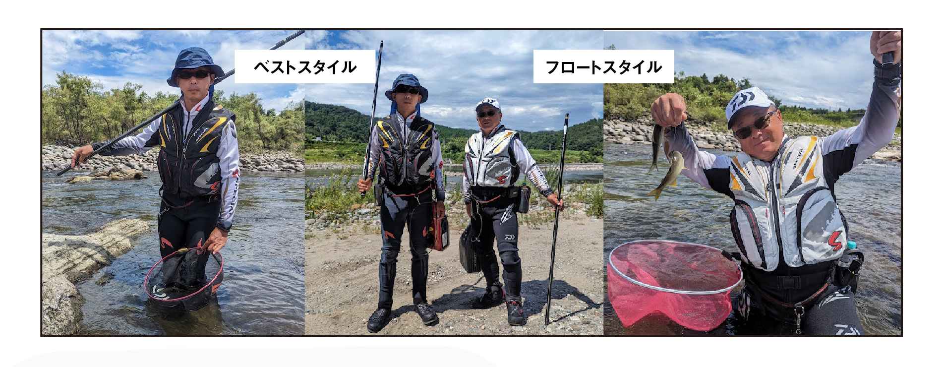 足場の悪いフィールドや、川の中に立ち込むような状況下ではフロートベストスタイル。