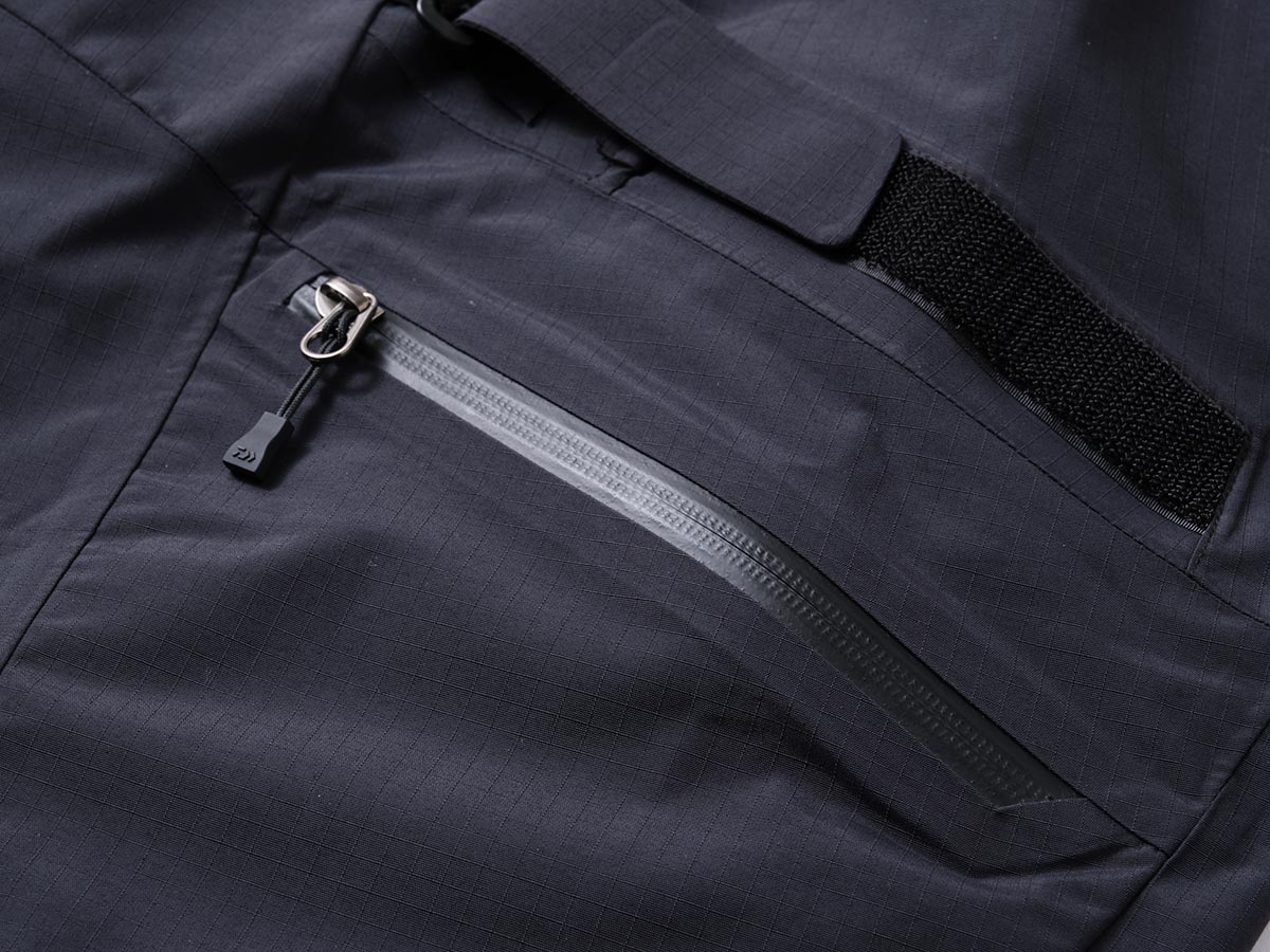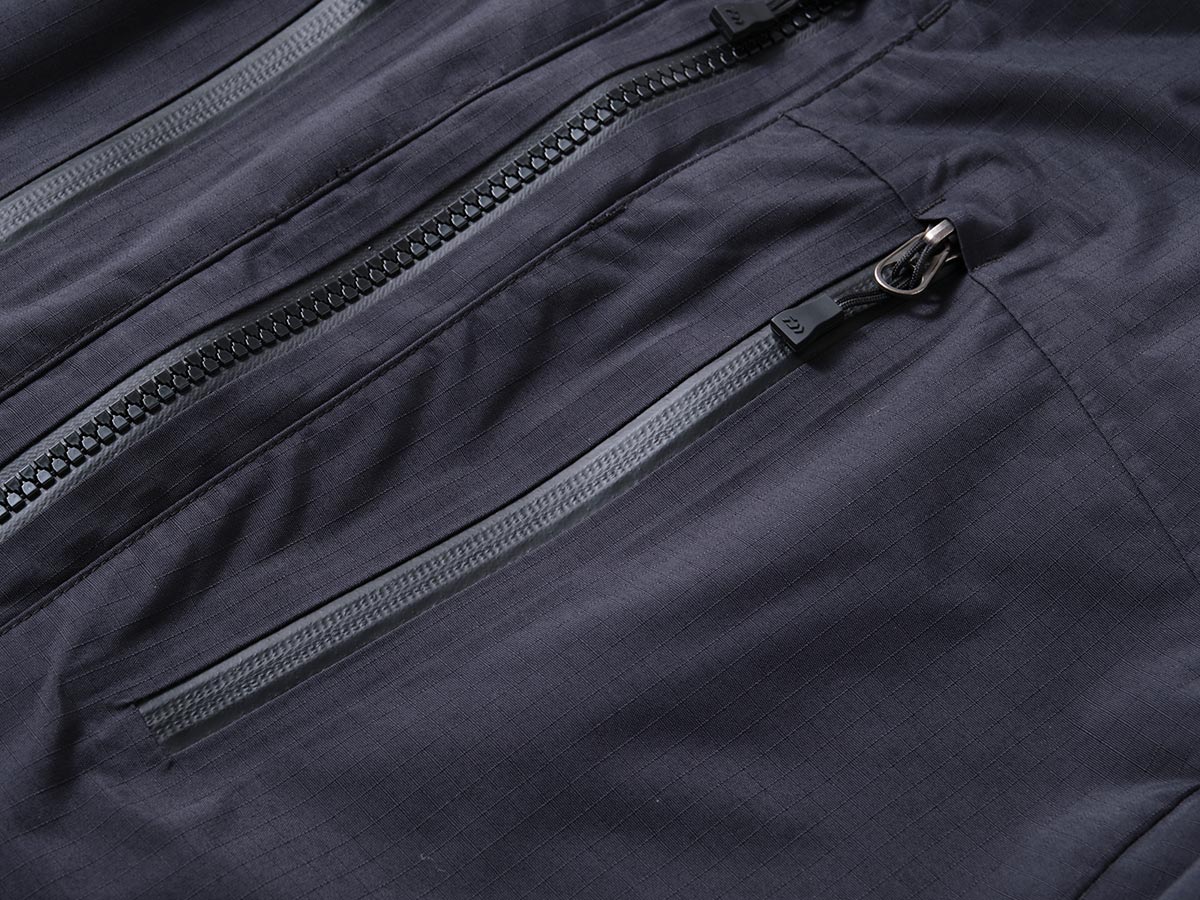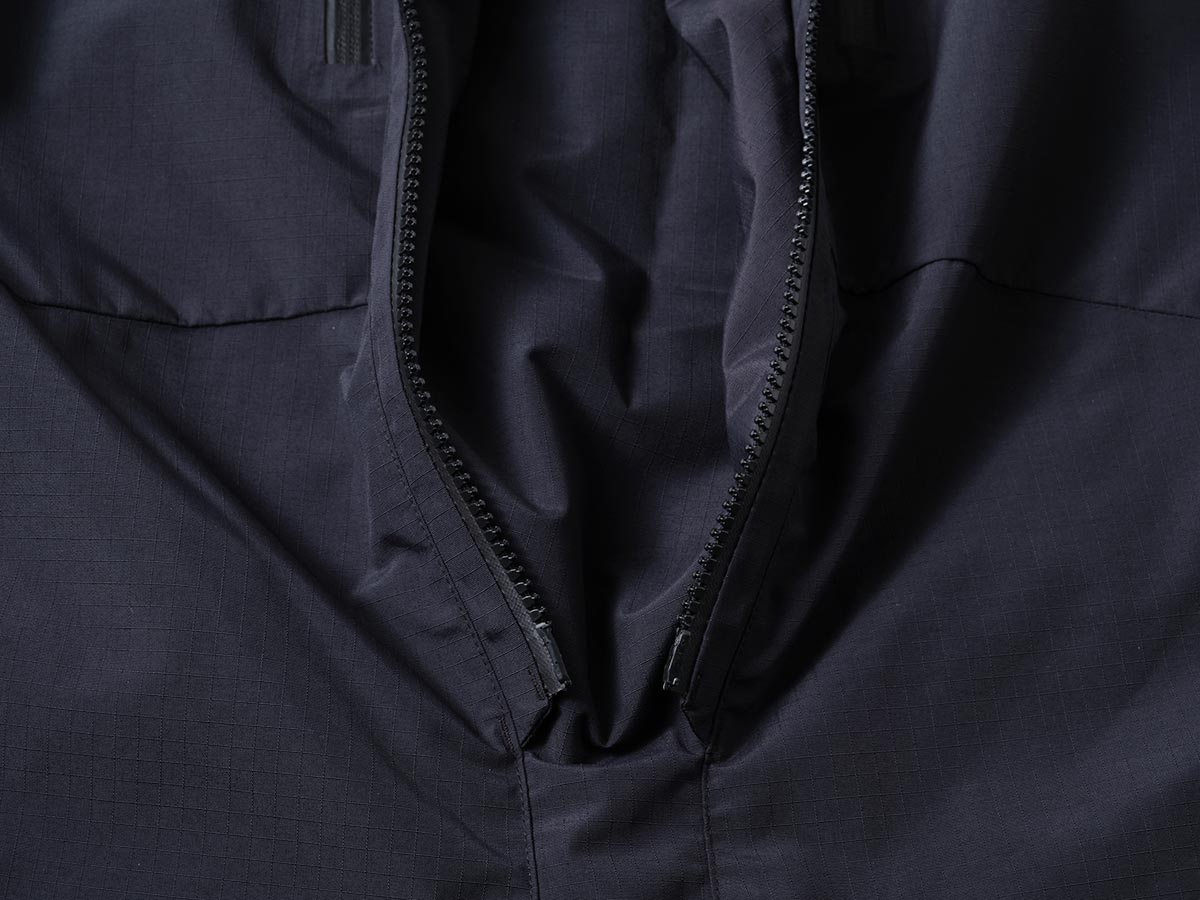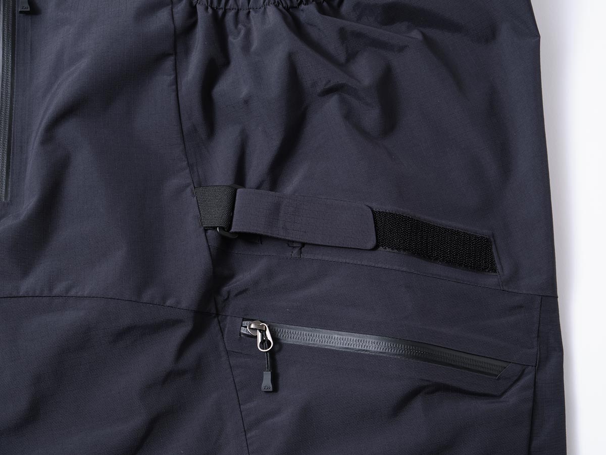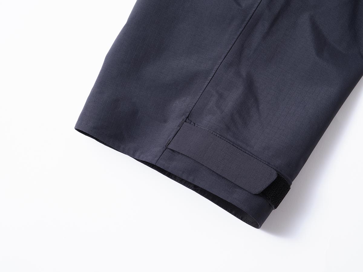 リップストップ生地のしっかりとした2.5層レイン生地を採用。裏地メッシュ付きで肌離れよく、快適に着用可能。耐久撥水性能により透湿性能を保ちやすく、快適に着用可能。サスペンダー付きのビブタイプのパンツで、ずり落ちず、動きやすい。パンツのウエスト両脇にサイズ調整用タブを搭載し、ウエストのフィット感を素早く調整可能。マットな生地感で普段にも着やすいデザイン。腰ポケット位置をサイドにすることで、座った際にもポケット内の小物が干渉しにくい。フロントには上下から開閉できる止水ファスナーを採用。フロントファスナー下には三角マチを設け、水の浸入を軽減。