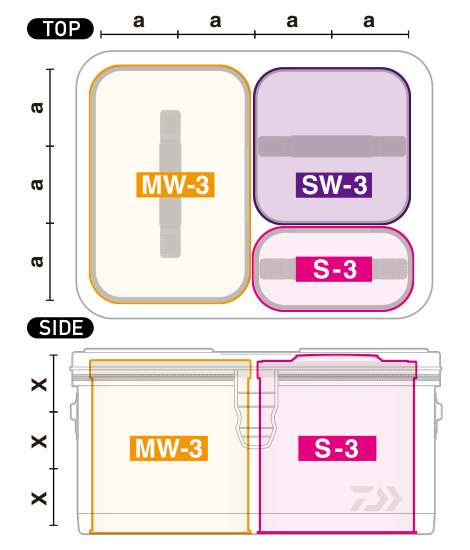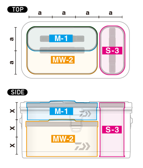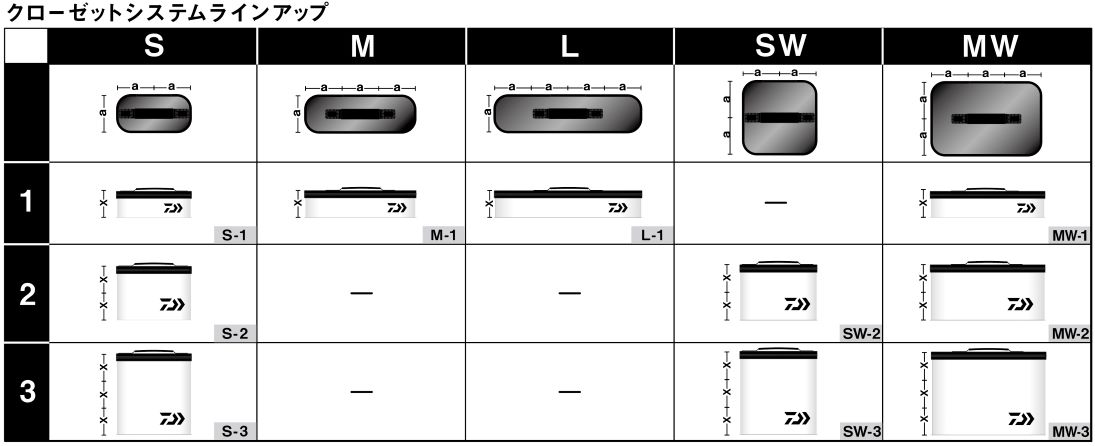 クローゼットシステムとはタックルバッグ等へ組み合わせ自由にぴったりと収納ができるシステム。クローゼットシステムのロゴが付いた商品が対象。