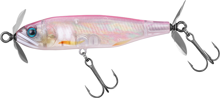 ペラに縦方向に向けて入った折れ目は、着水時や大型の魚がバイトした時などの強い衝撃が加わってもペラが変形しないギミック。ボディサイズが上がってルアー全体の重さが増せば増すほどに、着水時にペラが受ける衝撃は大きくなる。ペラが変形しないということは、ルアーが常に一定の性能を保ち続けるということ。魚を釣るたびにペラの曲がりを直さなくてはいけなかった従来のプロップベイトの弱点を大幅に改善した。
