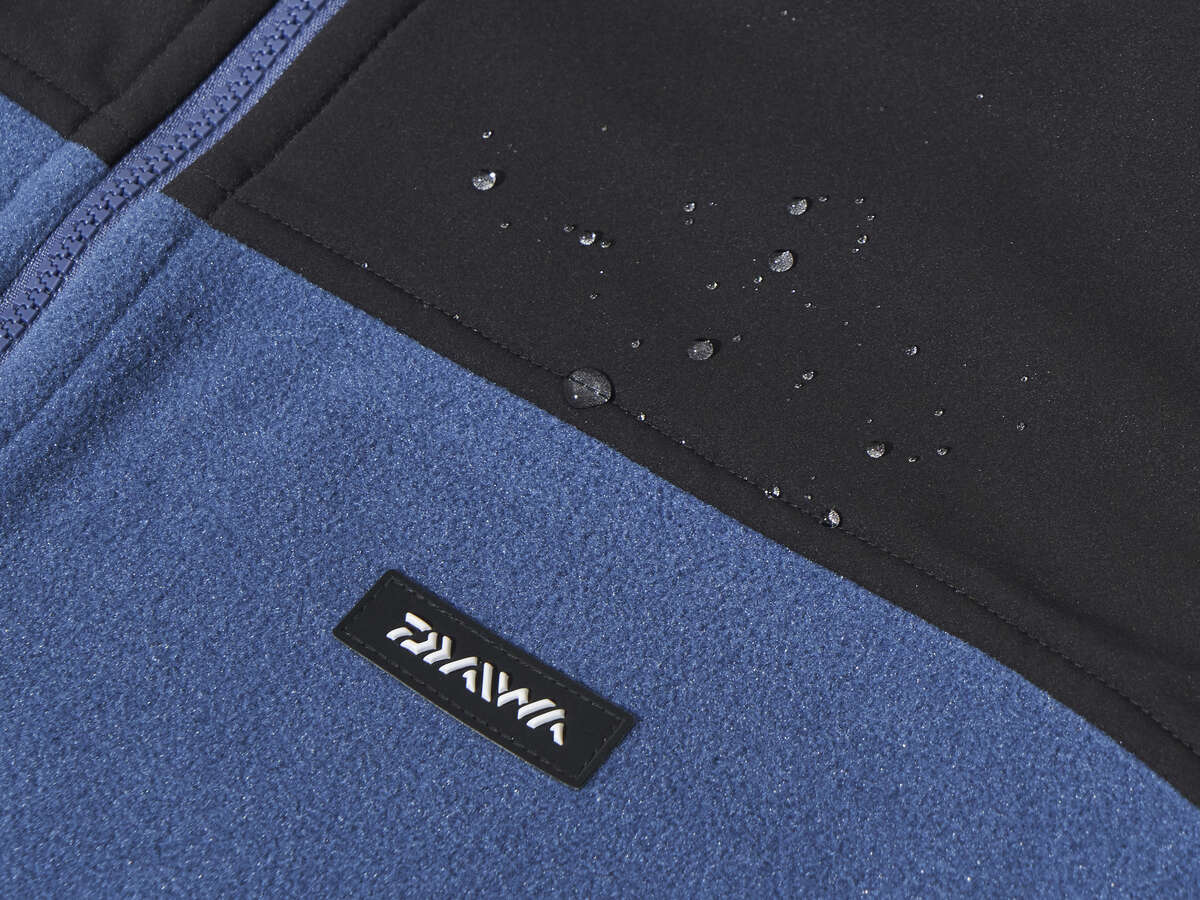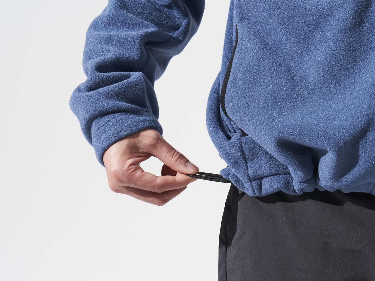 雨天時、レインウェアと重ね着した際に濡れやすい首周りと、特に擦れやすい肩周りには撥水素材の補強を使用。裾にはスピンドルゴムを配し、冷気を防ぎたいときに絞ることが可できる。
