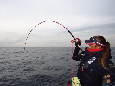NEWバイパーの特徴は柔軟で高感度のチューブラー素材の穂先にV-ジョイントで接合される元竿部分にある。それは単純に「元先部分にバットパワーがある」という話では無い。高密度グラスソリッドにX45のダイワが誇る素材技術を駆使したクロスを巻きつけて作製された元竿は、張りとパワーを有することは勿論のこと、やりとりの際、魚が引き込めば柔軟で粘りある穂先部分と一体化しながら美しく自然につながる形で曲がり込む。また真鯛が向きを変えたり浮き上がったり、船の揺れでラインテンションが減じるように変化した場合には、しなやかな粘りでハネを抑え、スムーズに曲がり込みポイントを穂先部分と協調しつつ遠近自在に変化させラインテンションを安定させながらバラシを防ぐのである。3Mという長さが、手持ちの操作性を優先したショートロッドに比べ、魚を掛けてからのラインテンションの安定したコントロールに非常に有利になるのだ。これに加えパワーJOGレバーとATD(オートマチックドラグシステム)搭載のシーボーグを筆頭とするダイワ電動リールを組み合わせることで、釣り人の腕、身体と一体化したバイパーは、毒蛇の如く魚の動きに追従する形で変幻自在なムチのような撓りを見せ、賢者の大鯛といえども手懐けてゆける。私自身、今までならヒットさせても逃していたような口唇皮一枚で掛かっている大鯛が、このロッドであがってきた経験をした。パワーと粘りを兼ね備えたバイパースティック300Mはまさに大鯛を狙って確実に仕留めるための比類無きアイテムといえる。