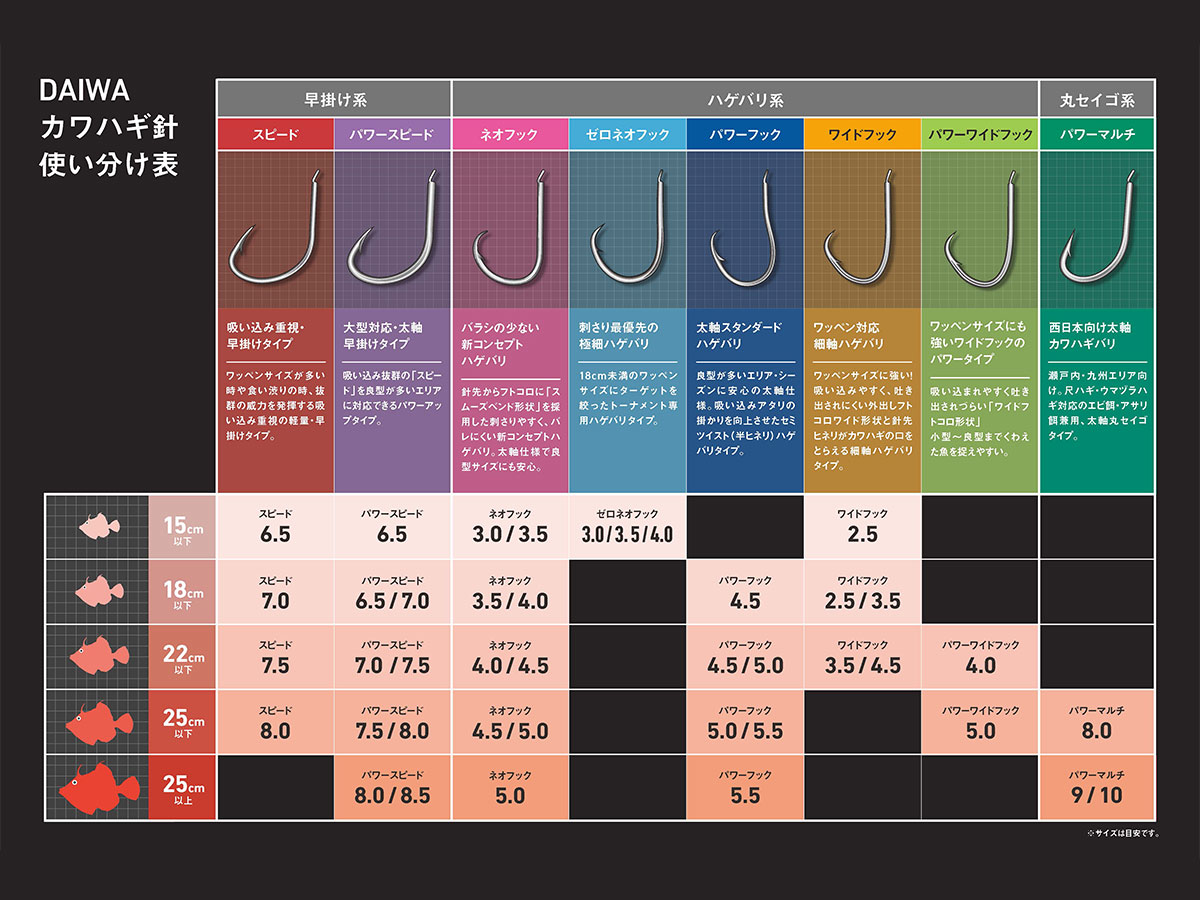 針はスピード/パワースピード/ネオフック/パワーワイドフックの4種類をご用意。