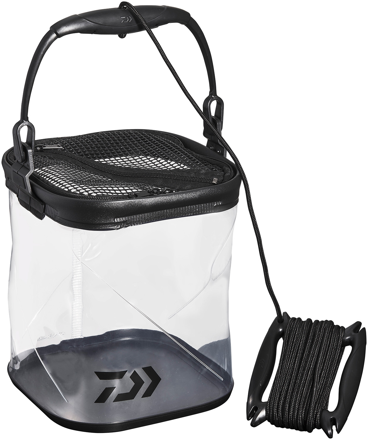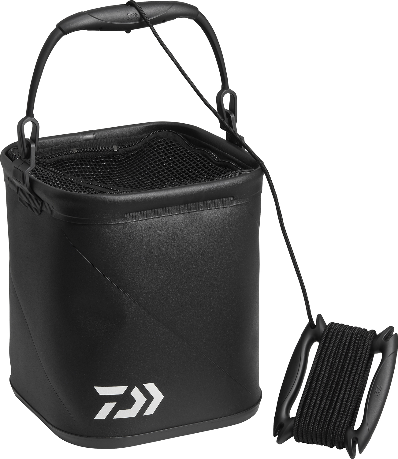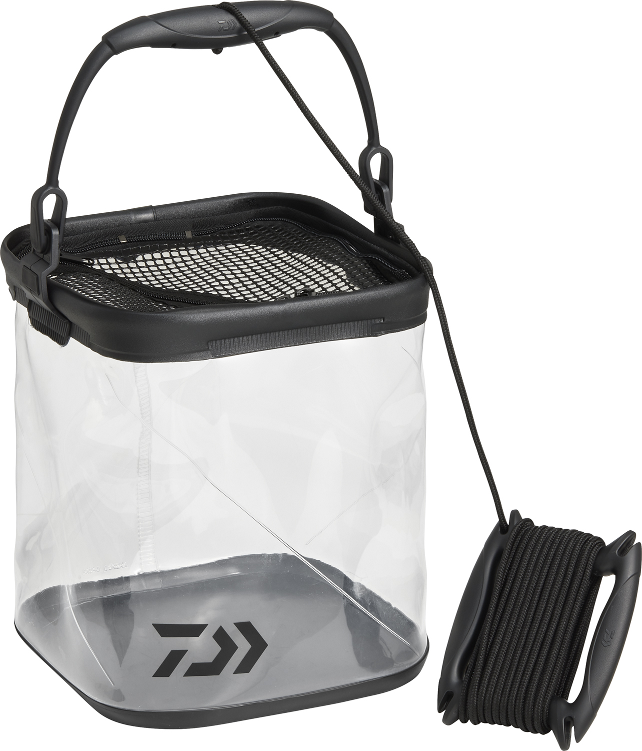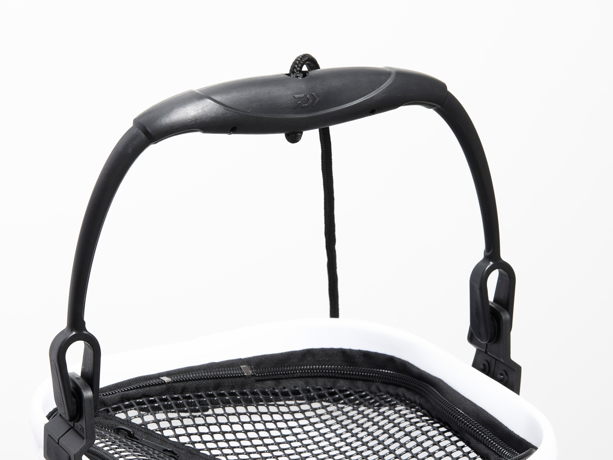握りやすく持ち運びやすい成型ハンドル、魚が飛び出しにくいメッシュフタ、握りやすくて巻き取りやすいロープホルダー(ロープ長さ8m)付き。