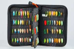 M / ML / Lサイズの中央パネルをフラットなフォームとし、格子状印刷を付ける事で、縦横両方向へのルアーの取り付け目安となり、ルアーを等間隔に取り付けも可能。大きなスプーンも楽々収納。