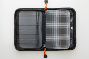 脱落したルアーのフックが引っ掛かりにくい「止水ファスナー(内側)」仕様。全4サイズ展開で様々なニーズに対応し、ヒップバッグ等のルアーバッグに収納しやすい「ML」サイズが新登場。縦横両方向への取り付け目安となる「格子印刷」付き中央パネル(Sサイズ除く)を備えています。閉じた際、収納したルアー同士への負荷が少ない幅広ファスナーを採用し、汚れが落としやすいPVC素材を使用。さらに、ルアー同士の接触を軽減する「クリア中仕切り」も付いています。