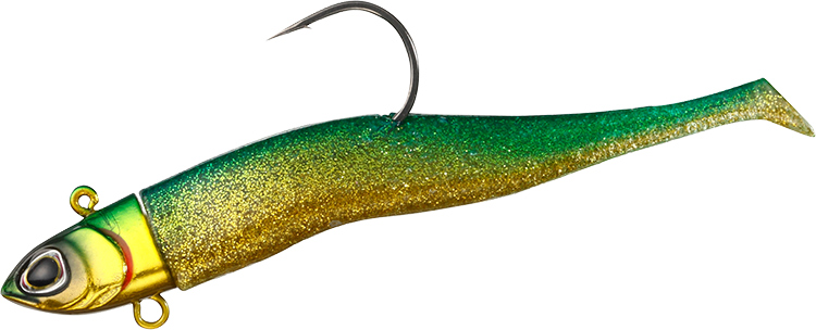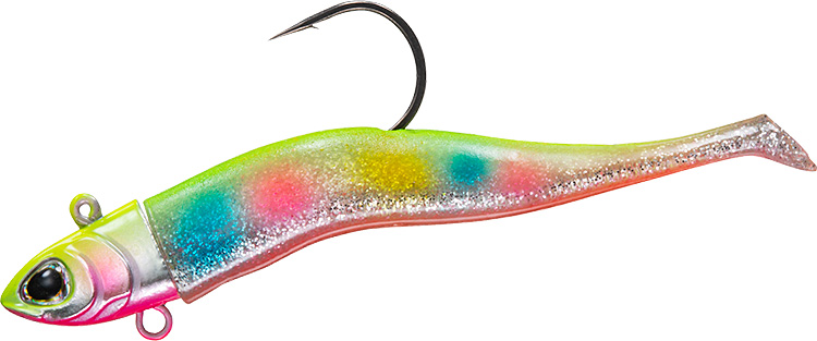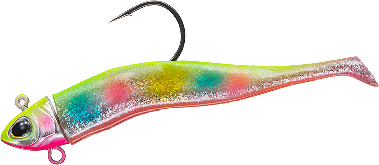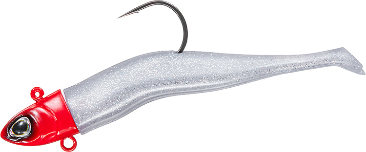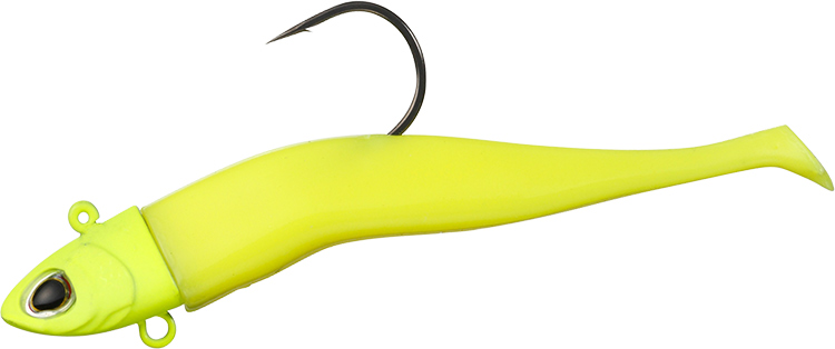 三角断面ブーメランボディ形状&極小テール採用により、タダ巻きでは小魚のような波動を発生、ジャークでは左右に大きくダートさせるワインド釣法にも対応。スローリトリーブでは、水鳥の足ヒレ形状からヒントを得たダックフィン極小テールが微振動するだけのアクションを演出。ファストリトリーブではブーメラン形状のワーム後半部が水流でうねりながらバイブレーションし、まるで必死に逃げる小魚のような波動を発生。ワーム部を中央でへの字に曲げることで、ジャークアクションによるワインド釣法では左右に大きく安定してダートし、リアクションバイトを誘発。ジグヘッド腹部には、トレブルフックも搭載可能なアイを設置。食い渋りに強いベイトフィッシュそっくりのリアルシェイプデザイン。