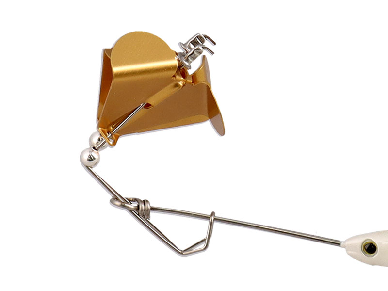 アルミペラを2枚搭載したバズベイト。特徴的な形状ながら、ツインペラによる恩恵は非常に大きい。通常バズベイトは着水からある程度リトリーブしないと水面までペラが上がってこず、一番バイトが期待できる着水直後のアクションを出しにくい。スティーズ ツインバズはペラが2枚あることで着水後すぐに急浮上しアクションを開始するため、バイトチャンスを逃さない。ペラが2枚付いていることで、姿勢安定にも貢献。高速リトリーブでもルアーが傾かずに泳ぎ切ることが出来る。また、バズベイトとは思えない飛距離を出せるのも、ツインバズの魅力だ。広範囲を探る釣りにおいて、大きなアドバンテージとなっている。スティーズ ツインバズはウエイトを1/4ozクラスとし、折りたためる構造を採用した。ペラ側のワイヤーをつまんでたたむことで、ケース内でかさばらず、ライトなタックルでルアーやタックルを絞りたい陸っぱりの釣りでも重宝出来る。是非、スティーズ ツインバズの威力を体感してほしい。