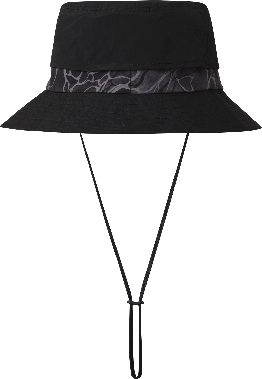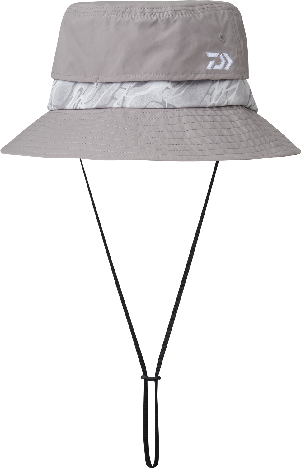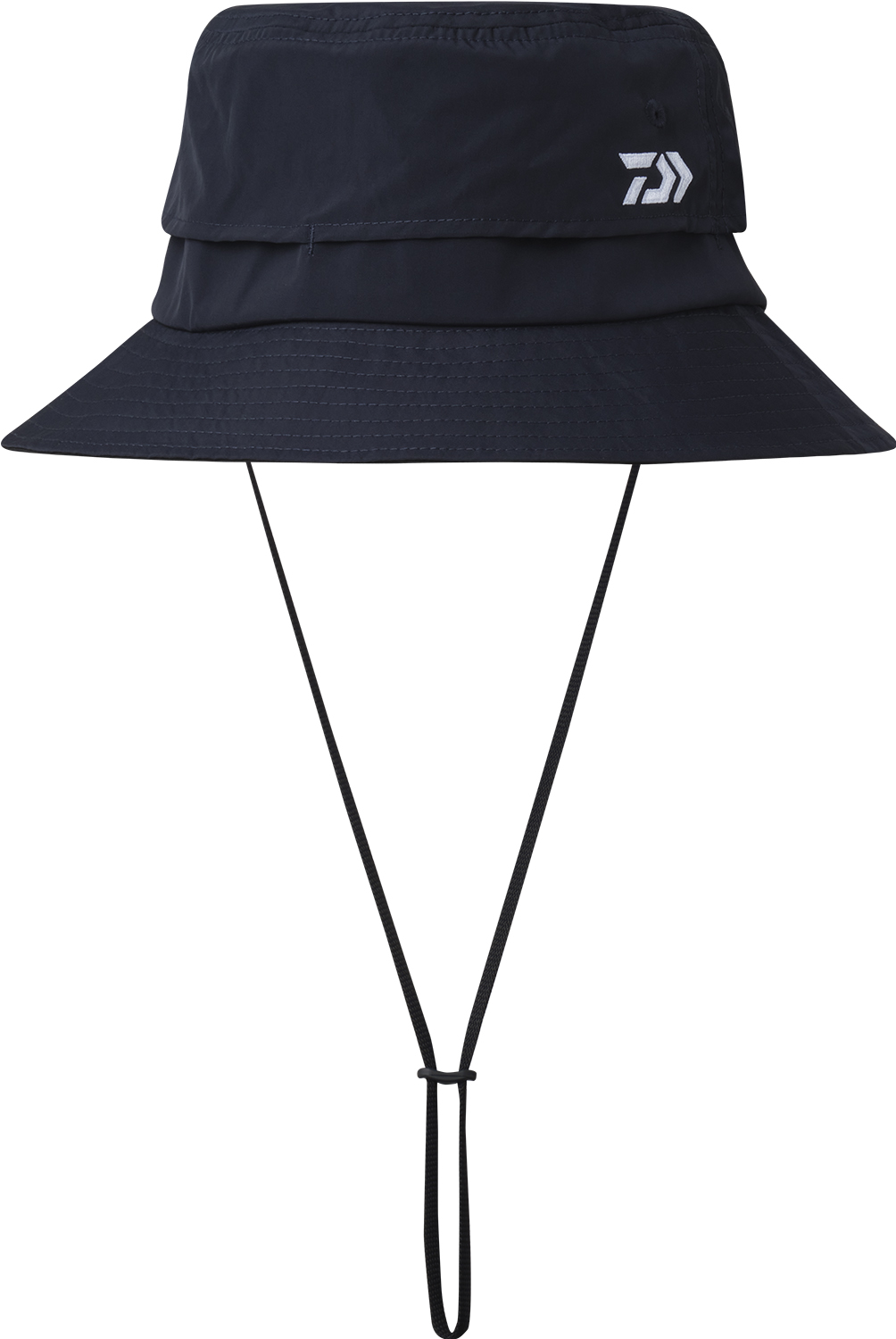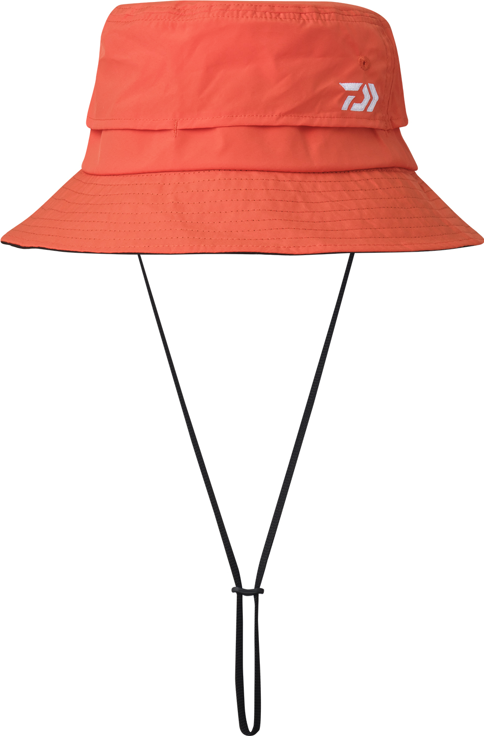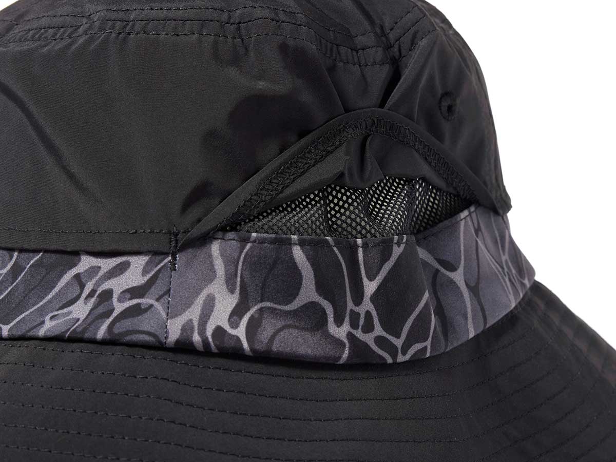 ベンチレーションメッシュを配し、涼しいハット。つば裏はブラックで水面の照り返しを防ぎ、見やすくなっている。風で飛ばされにくいよう、顎ひも付き。