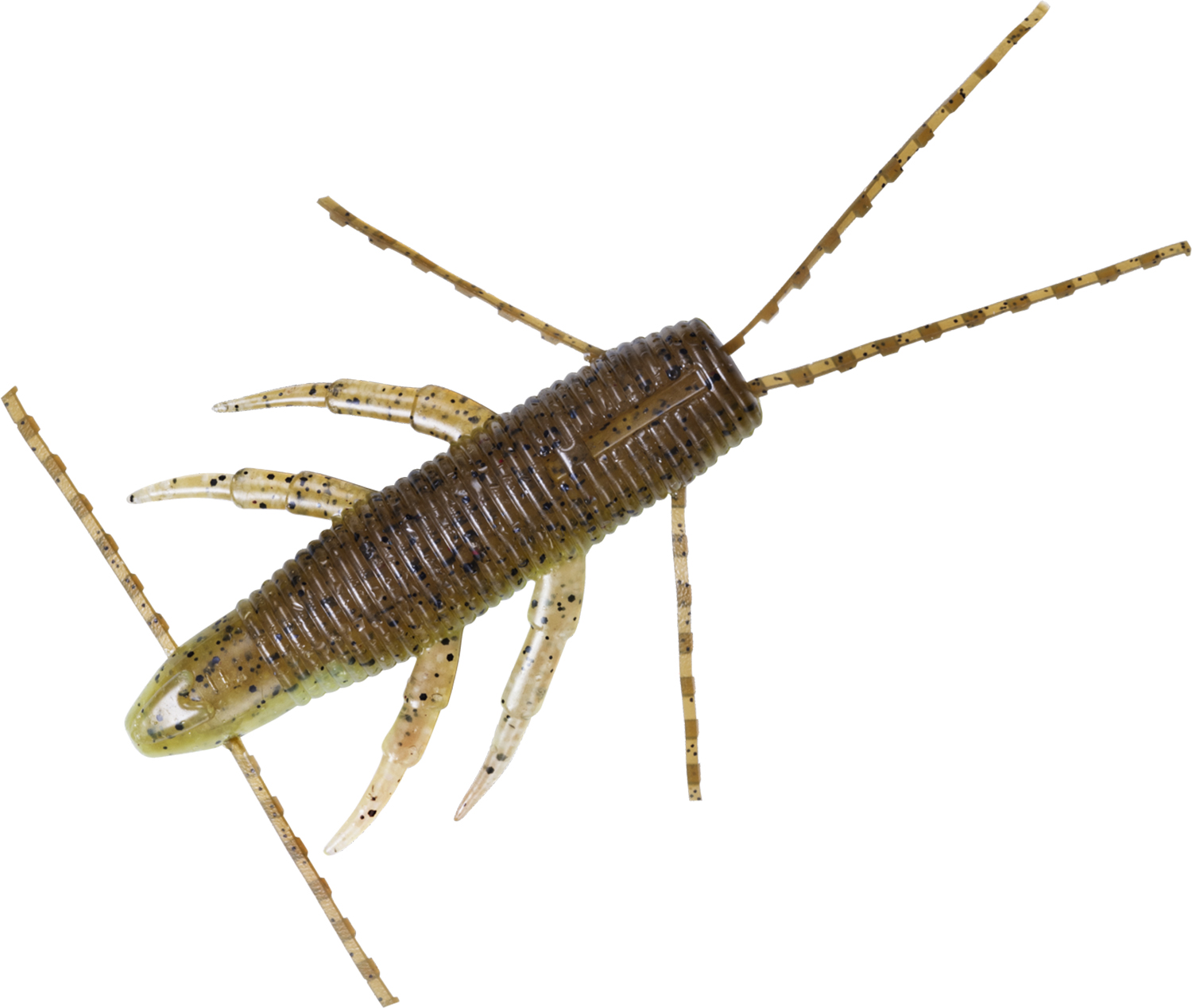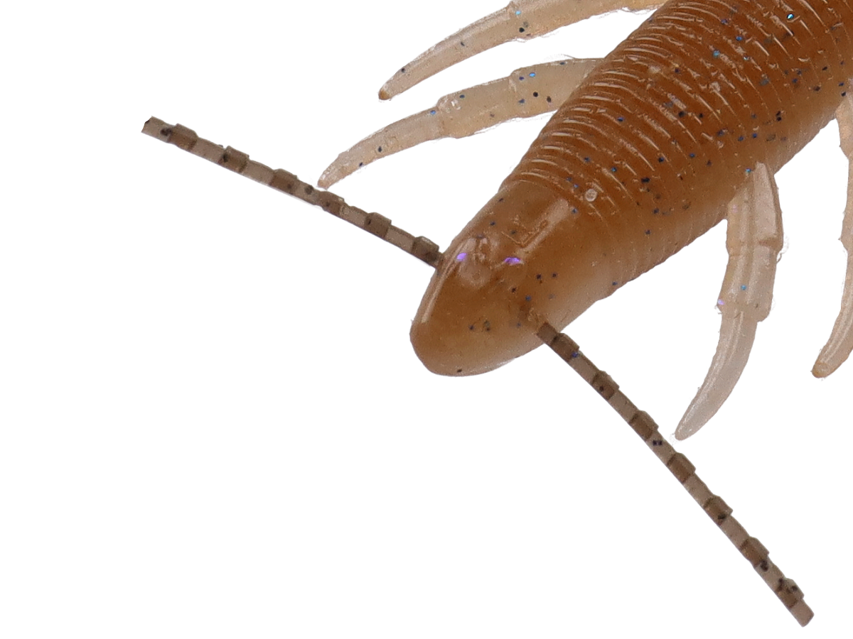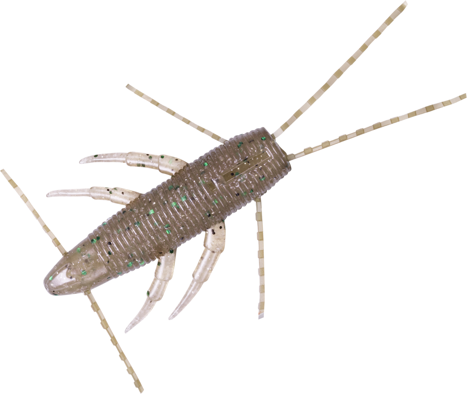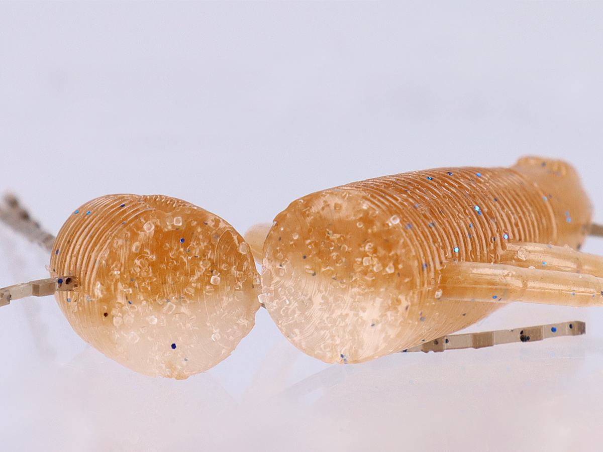 シリコンラバーの弱い波動とワーム素材の強い波動を組み合わせでバスの興味を惹く。水平フォールするようデザインされたボディとピリピリと動く脚が強烈にアピールする。2.4”はテール側に0.9g~1.3gのネイルシンカーを刺すことでバックスライドアクションも可能に。