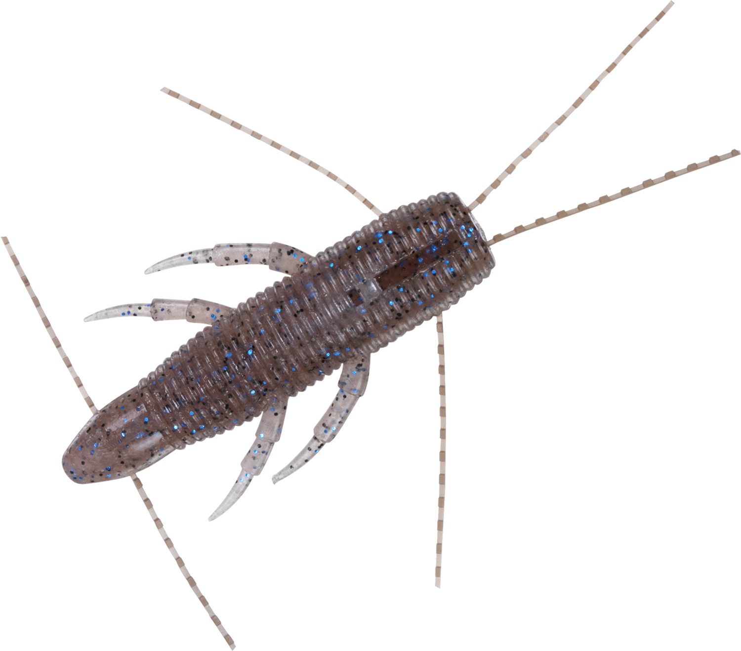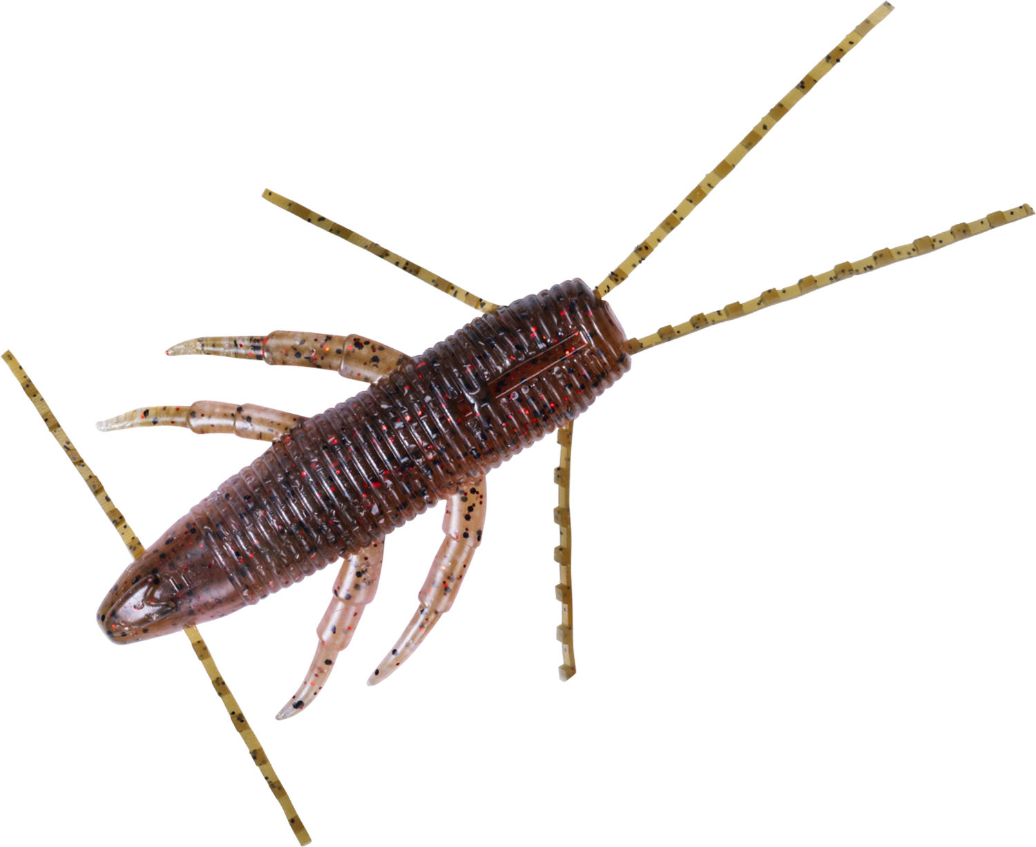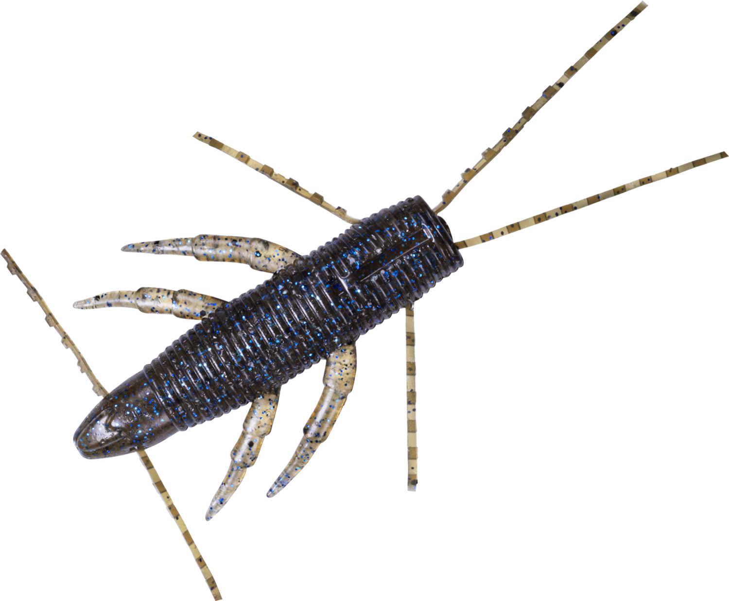 シリコンラバーの弱い波動とワーム素材の強い波動を組み合わせでバスの興味を惹く。水平フォールするようデザインされたボディとピリピリと動く脚が強烈にアピールする。2.4”はテール側に0.9g~1.3gのネイルシンカーを刺すことでバックスライドアクションも可能に。