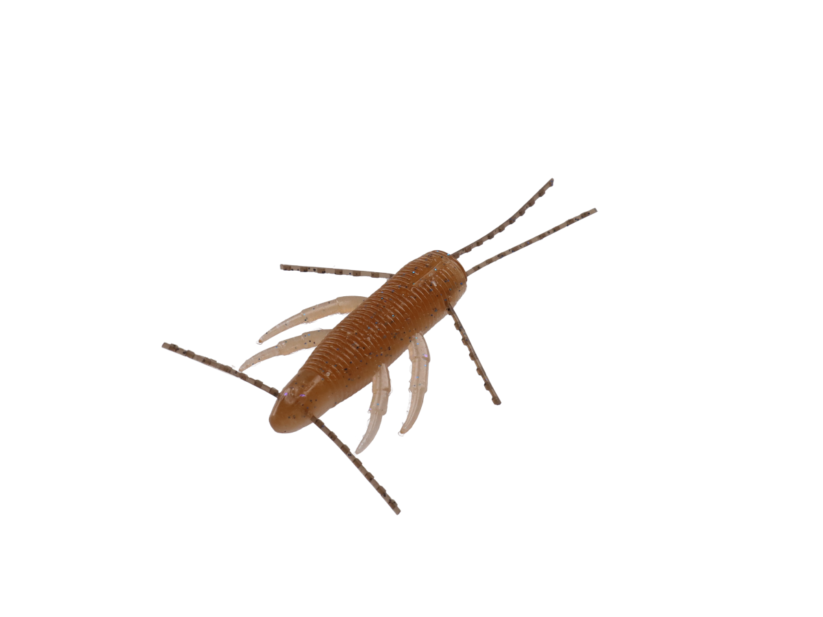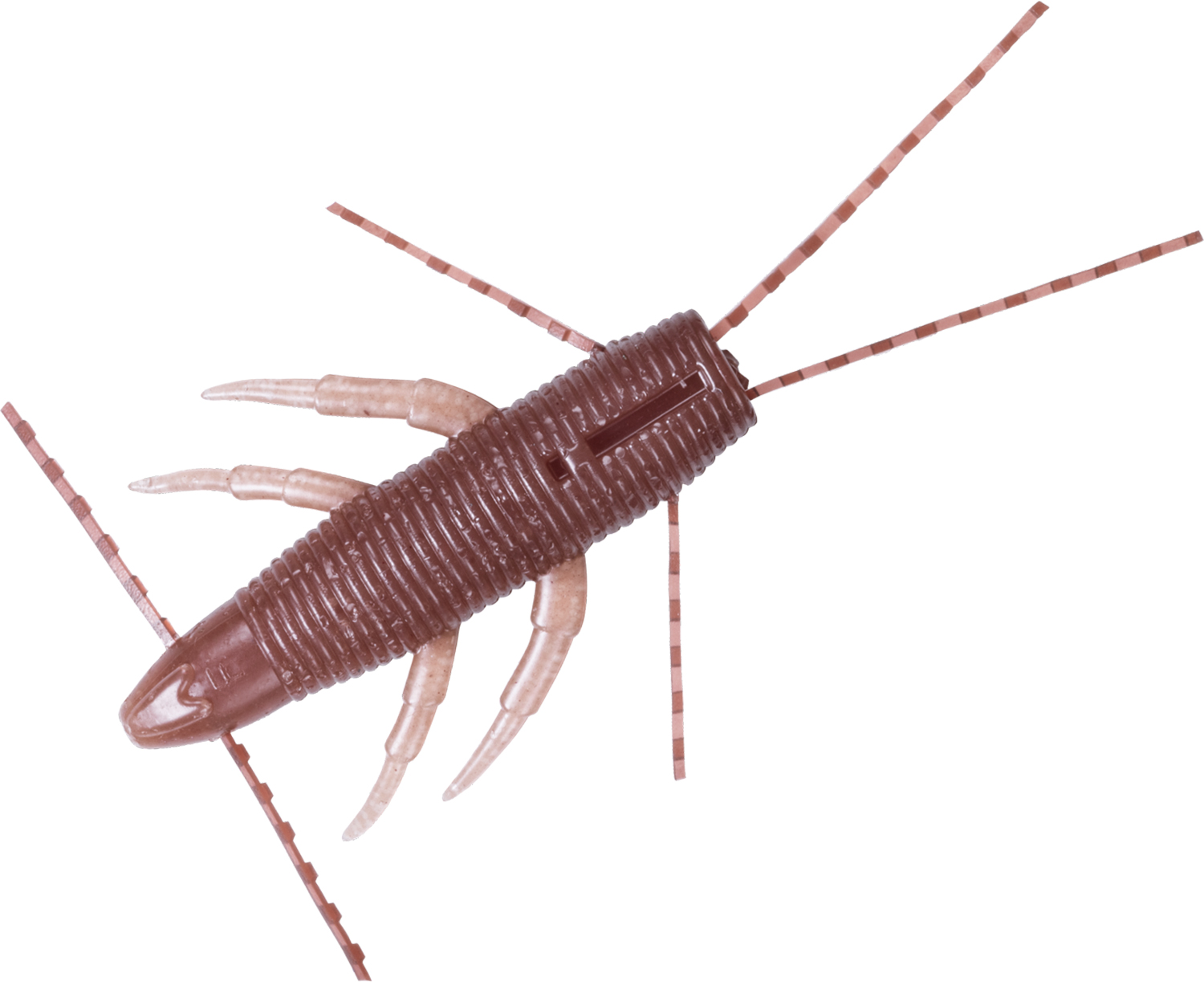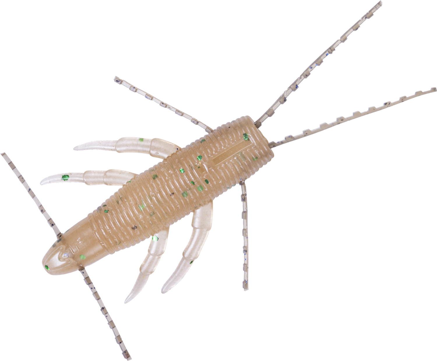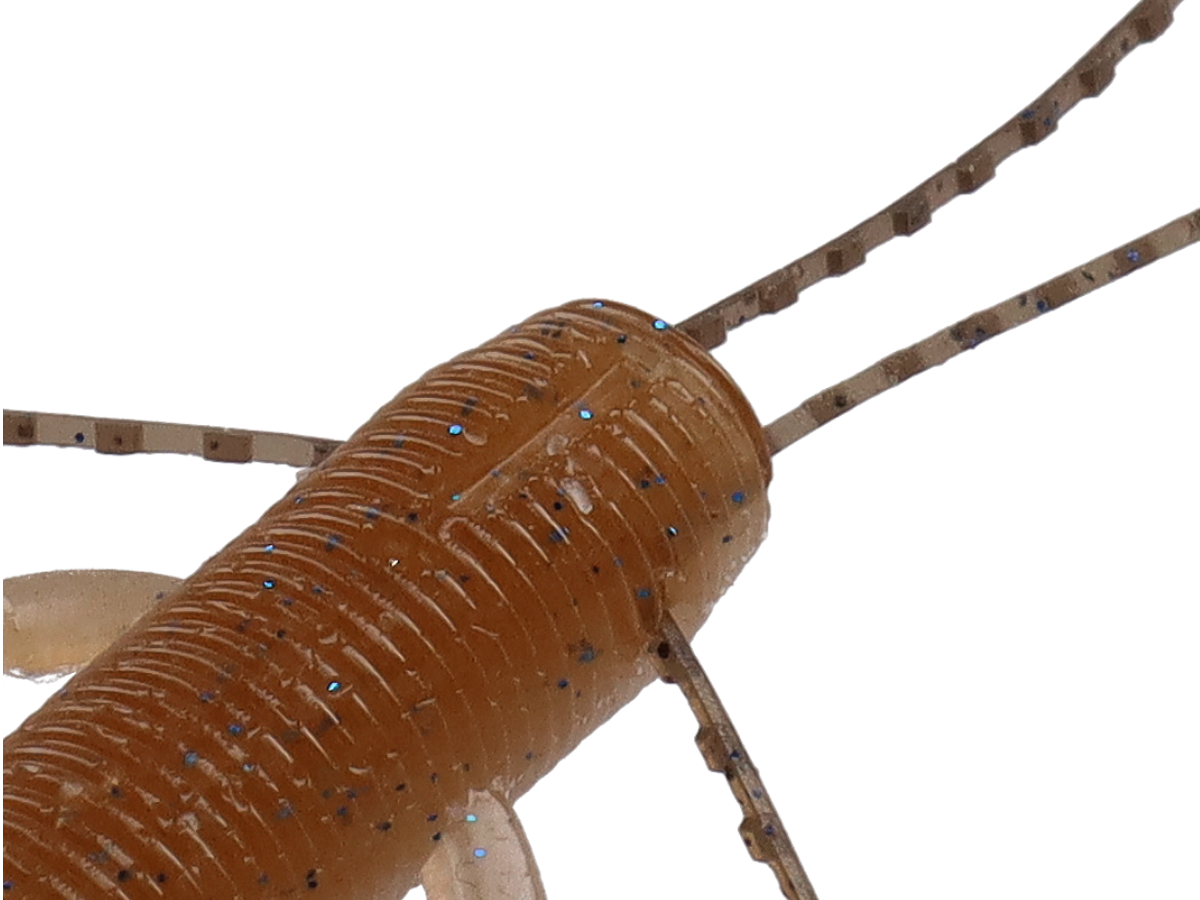 シリコンラバーの弱い波動とワーム素材の強い波動を組み合わせでバスの興味を惹く。水平フォールするようデザインされたボディとピリピリと動く脚が強烈にアピールする。2.4”はテール側に0.9g~1.3gのネイルシンカーを刺すことでバックスライドアクションも可能に。