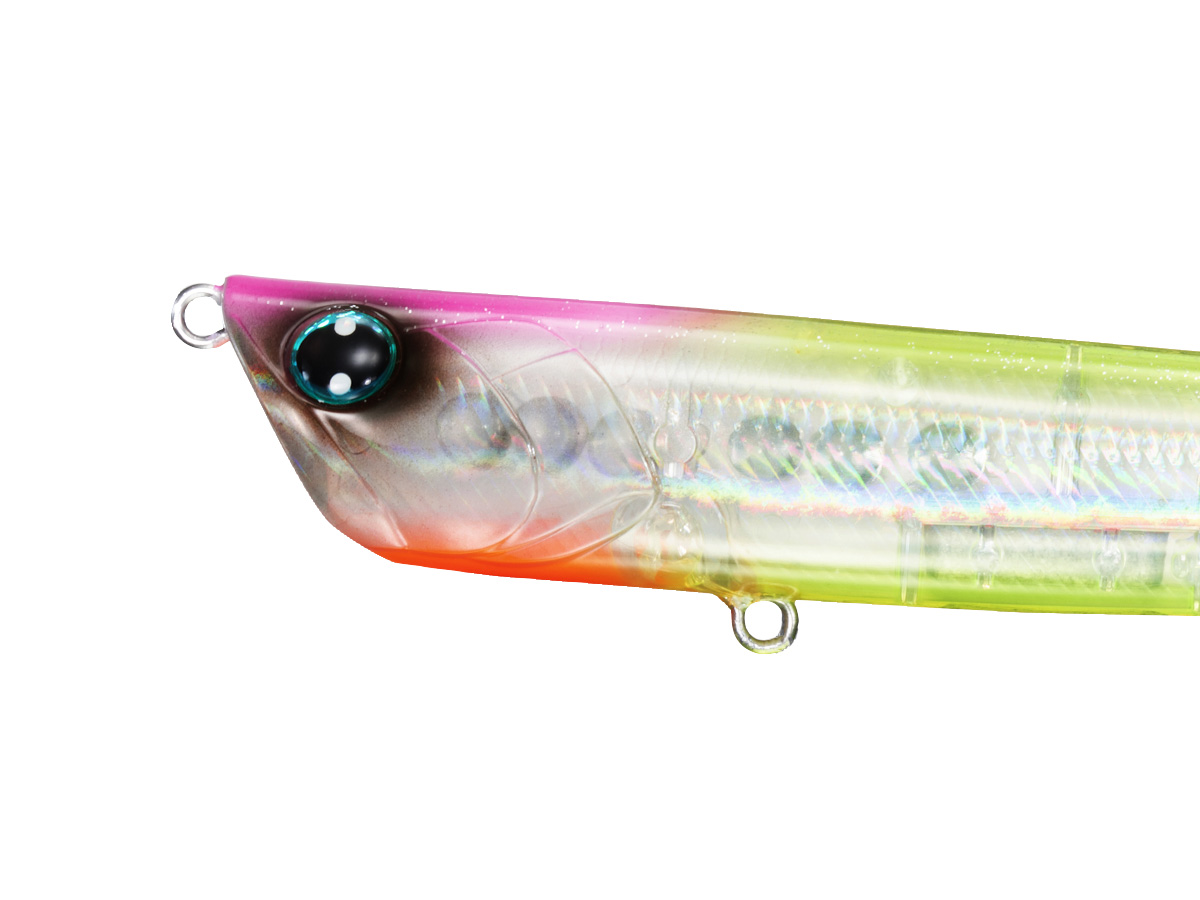 ただ巻きをするだけで斜めに切ったヘッドが水を受け水を左右にかき分けてヘッドを振り、水面や流速の変化で不規則にダイブ&スプラッシュする攻撃型アピール系ルアー。十分な飛距離と立ち上がり性を両立させた重心移動システム塔載。小沼正弥監修。
