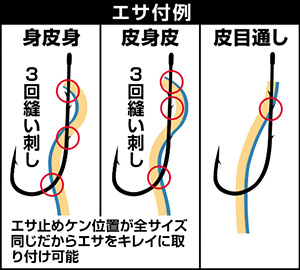 高槻テスターのタチウオ釣りの秘訣はエサ付けにあり!状況にあわせて身皮身、皮身皮、皮目通しの3パターンがあり、どの餌付けでもきれいに使用可能なSPケン付フックが特徴。