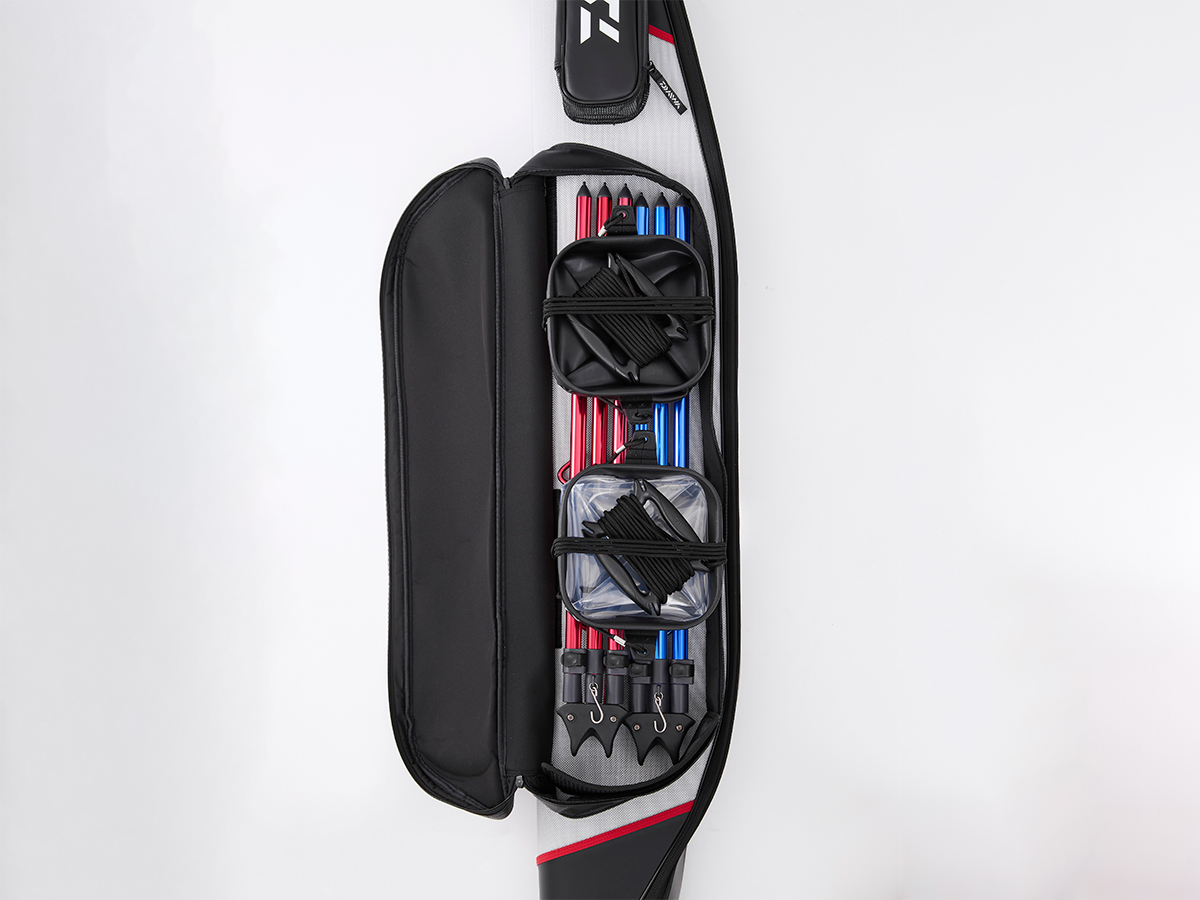 メインルームが大きく開口し中を確認しやすい新構造で、リール付き振出投げ竿2本まで収納できる段差収納ポケット付き。