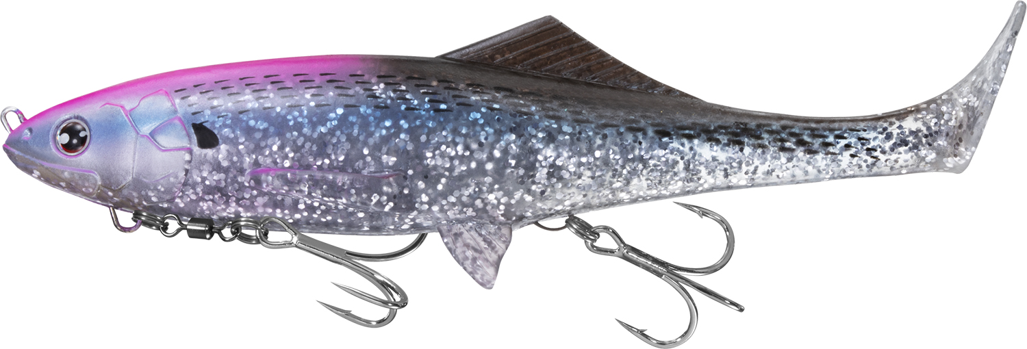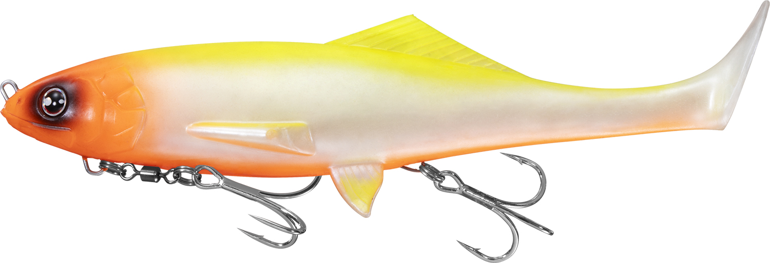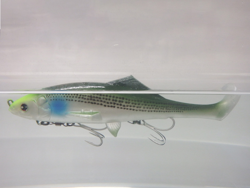 セイルアッパーはソフトエラストマー素材を採用しており、ハードルアーを見切ってしまうスレたシーバスでも反応させることができるフローティングスイムベイト。ソフト素材と逆付けテールはデッドスローリトリーブでもテールを振り子のようにしっかりと左右に振り、高い集魚効果を誇る。着水音に関してもハードルアーに比べナチュラルで、まるで魚がはねたような音であることからキャストを重ねてもスレにくいのが特徴。特に落ち鮎やコノシロなどのベイトについた大型シーバスを狙う際、ハードルアーとは違う引き出しとして是非ご使用いただきたい。