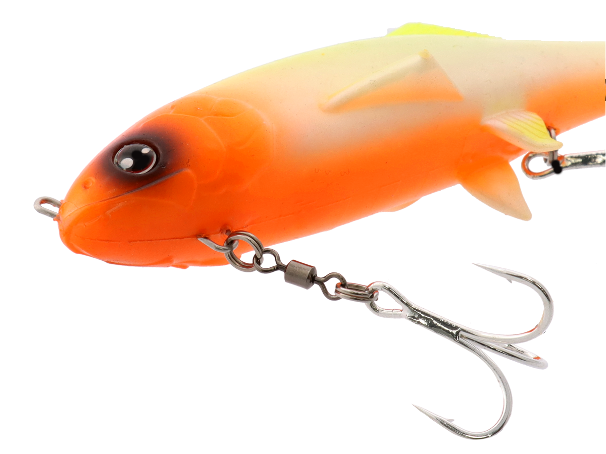 大型ルアーはルアー自体の自重が重く、シーバスがエラ洗いをした際などバレやすい。フロントフックとボディの間にスイベルを介することで捻りやエラ洗いに追随しバレにくくなる。