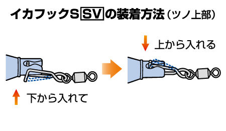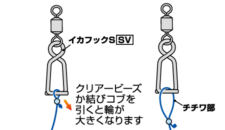 直結部にはスイベル付きの「快適イカフックSV」、直ブラ部には「快適イカフック」装備でツノ交換も簡単。
