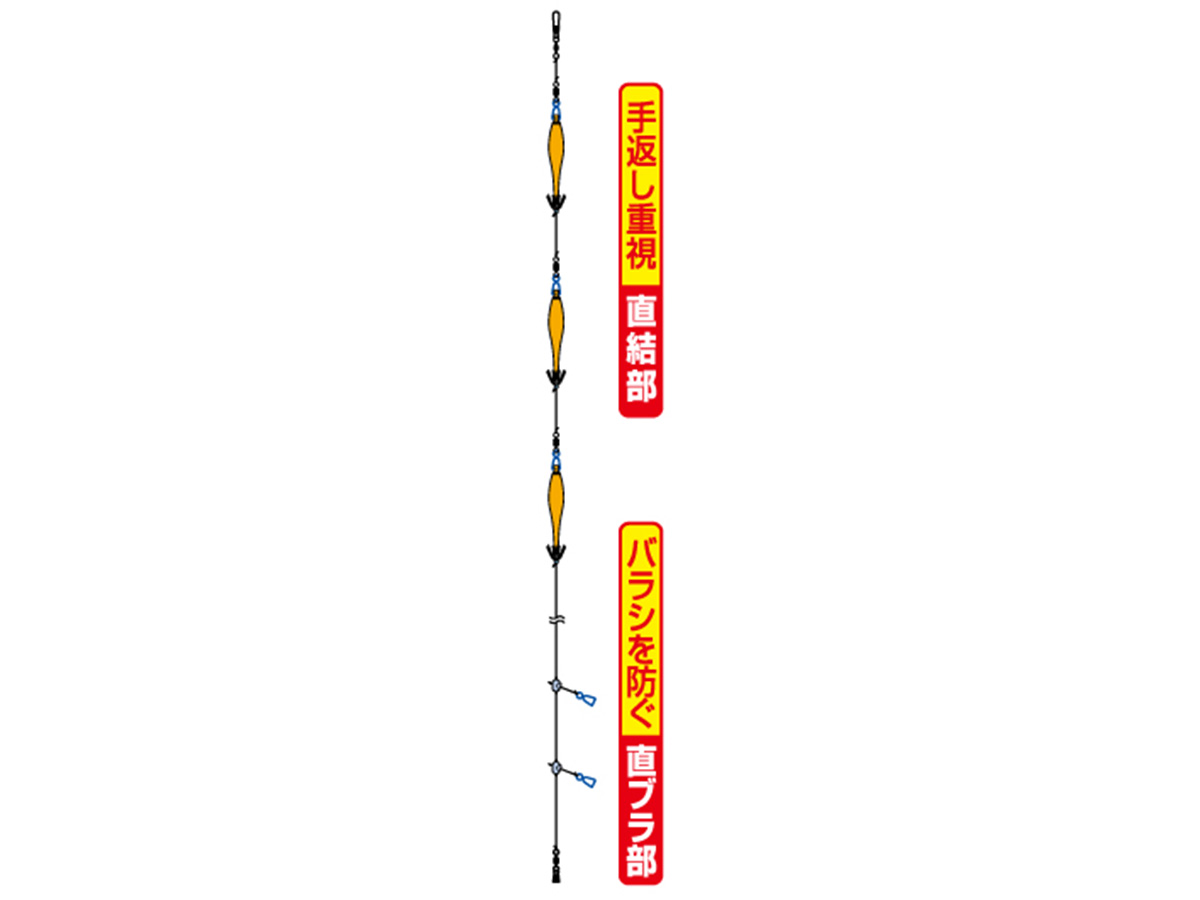 アイテム | 幹糸(号) | 入数 | 全長(cm) | 枝ス長さ(cm) | 枝ス(号) | 直ブラ数(本) | 直結数(本) | 間合(cm) | メーカー希望本体価格(円) | JAN |